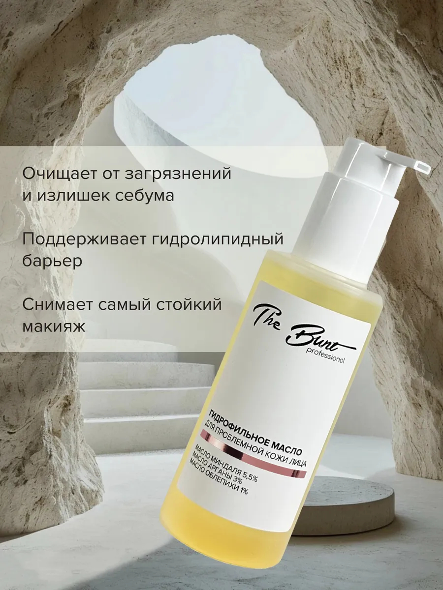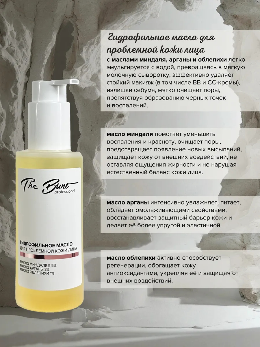 Гидрофильное масло для проблемной кожи лица с маслами миндаля, арганы и облепихи легко эмульгируется с водой, превращаясь в мягкую молочную сыворотку, эффективно удаляет стойкий макияж (в том числе BB и СС-кремы), излишки себума, мягко очищает поры, препятствуя образованию черных точек и воспалений.