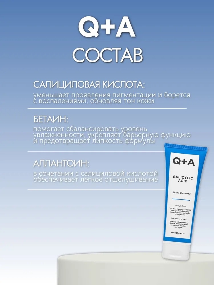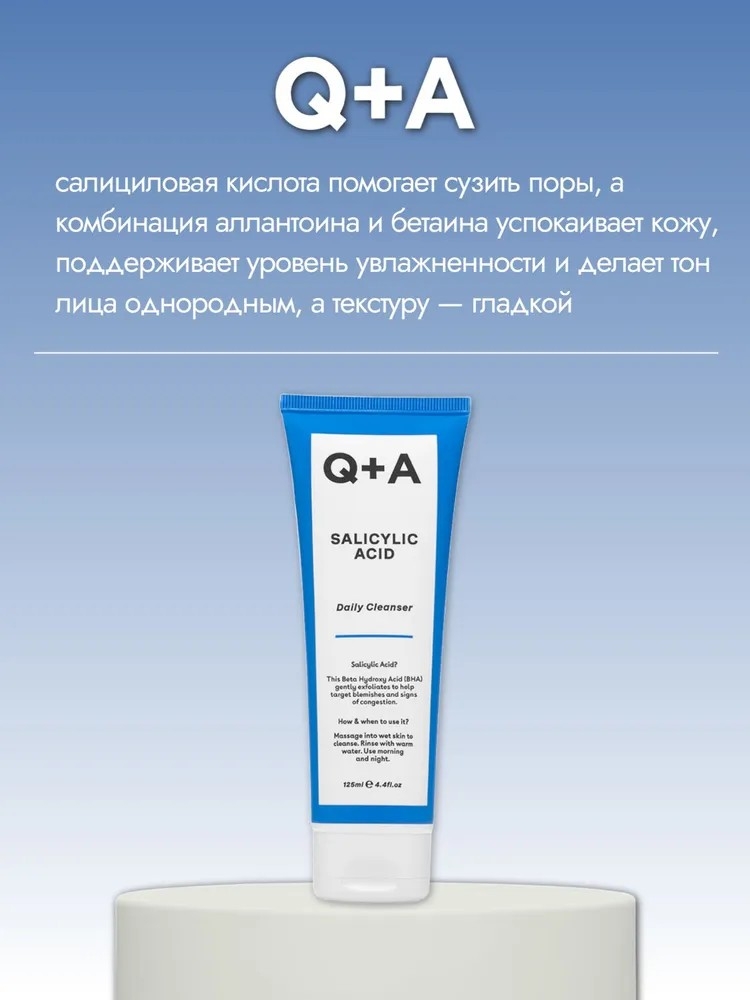 Обогащен салициловой кислотой, которая отшелушивает кожу, помогает сузить поры и уменьшить высыпания. В состав очищающего средства для лица входит аллантоин, который смягчает и успокаивает кожу, и бетаин, который удерживает влагу и предотвращает сухость, что делает его идеальным средством для ежедневного очищения лица, которое сохраняет кожу мягкой, чистой и свежей.