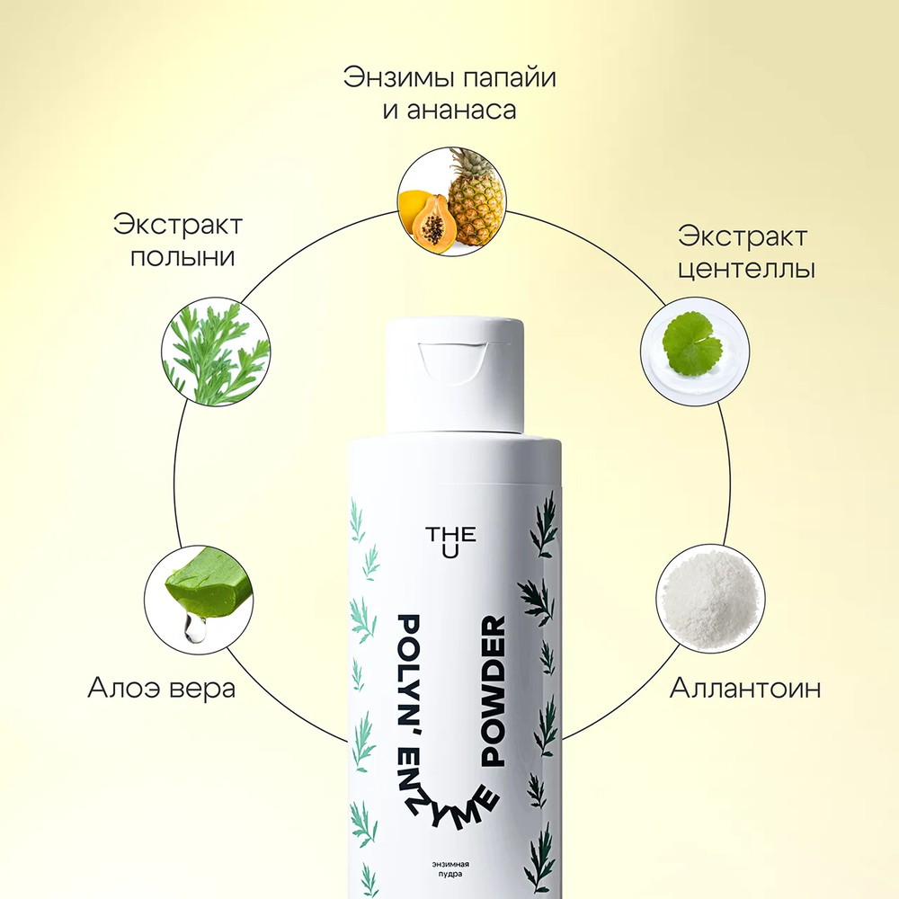 Мягкая пудра для глубокого очищения кожи лица и тела: деликатно удаляет загрязнения, остатки макияжа и излишки кожного сала. Отшелушивает ороговевшие клетки, выравнивает микрорельеф и тон кожи, не пересушивая кожу. Энзимы работают только на поверхности кожи, не нарушают барьерную функцию кожи и кислотно-щелочной баланс, безопасны, не сушат кожу. Экстракты центеллы и ламинарии оказывают успокаивающее действие, а экстракт полыни уменьшает покраснения, предотвращает появление раздражений и воспалений и стимулирует процесс регенерации.