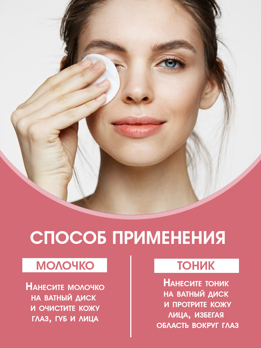 Перед применением встряхните флакон, нанесите молочко на ватный диск и протрите кожу лица, век и губ. Остатки промокните салфеткой или ополосните лицо водой. При необходимости процедуру повторите.Состав