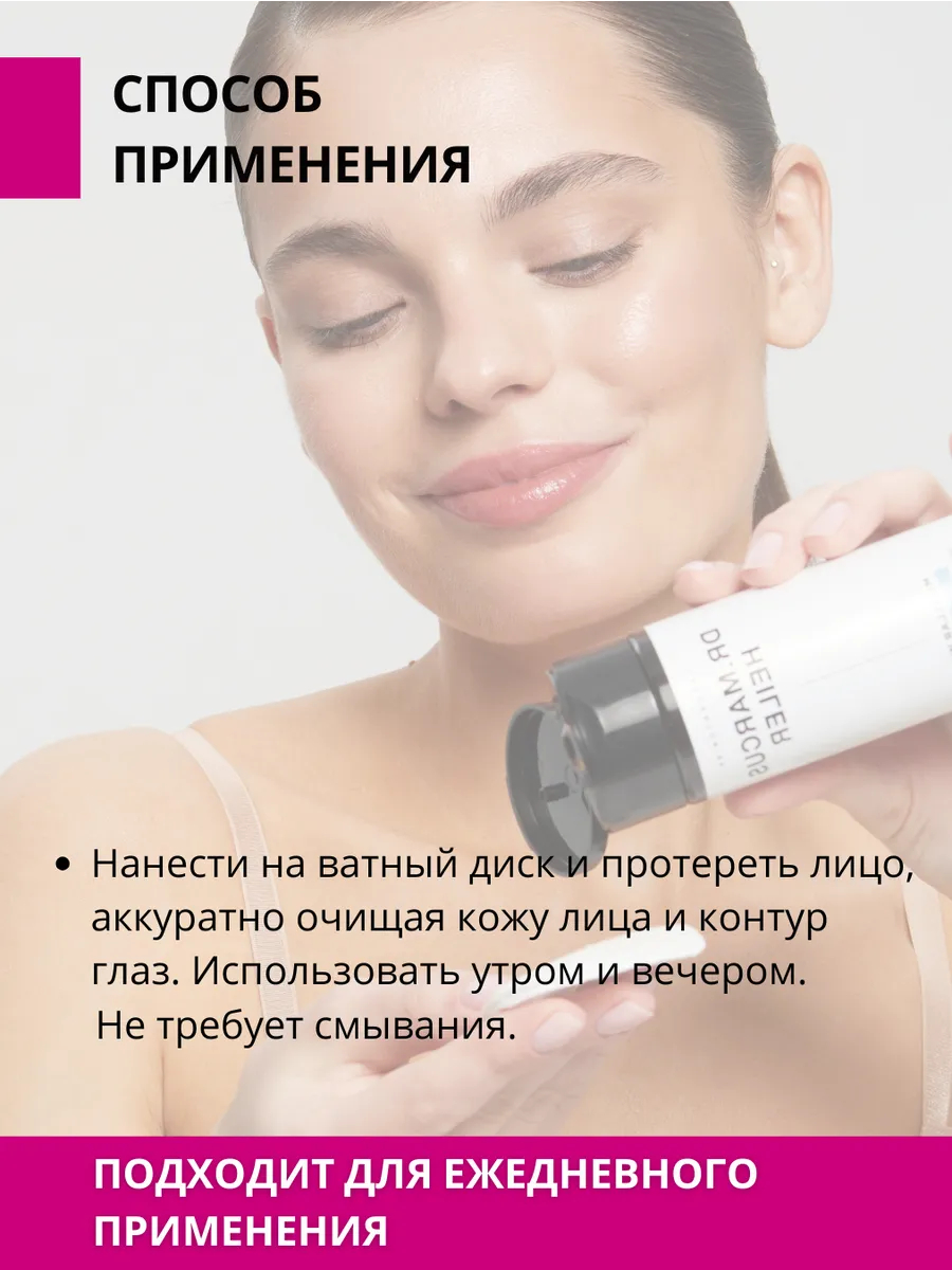Нанести на ватный диск и протереть лицо, аккуратно очищая кожу лица и контур глаз. Использовать утром и вечером для ежедневного очищения эпидермиса. Не требует смывания.Состав