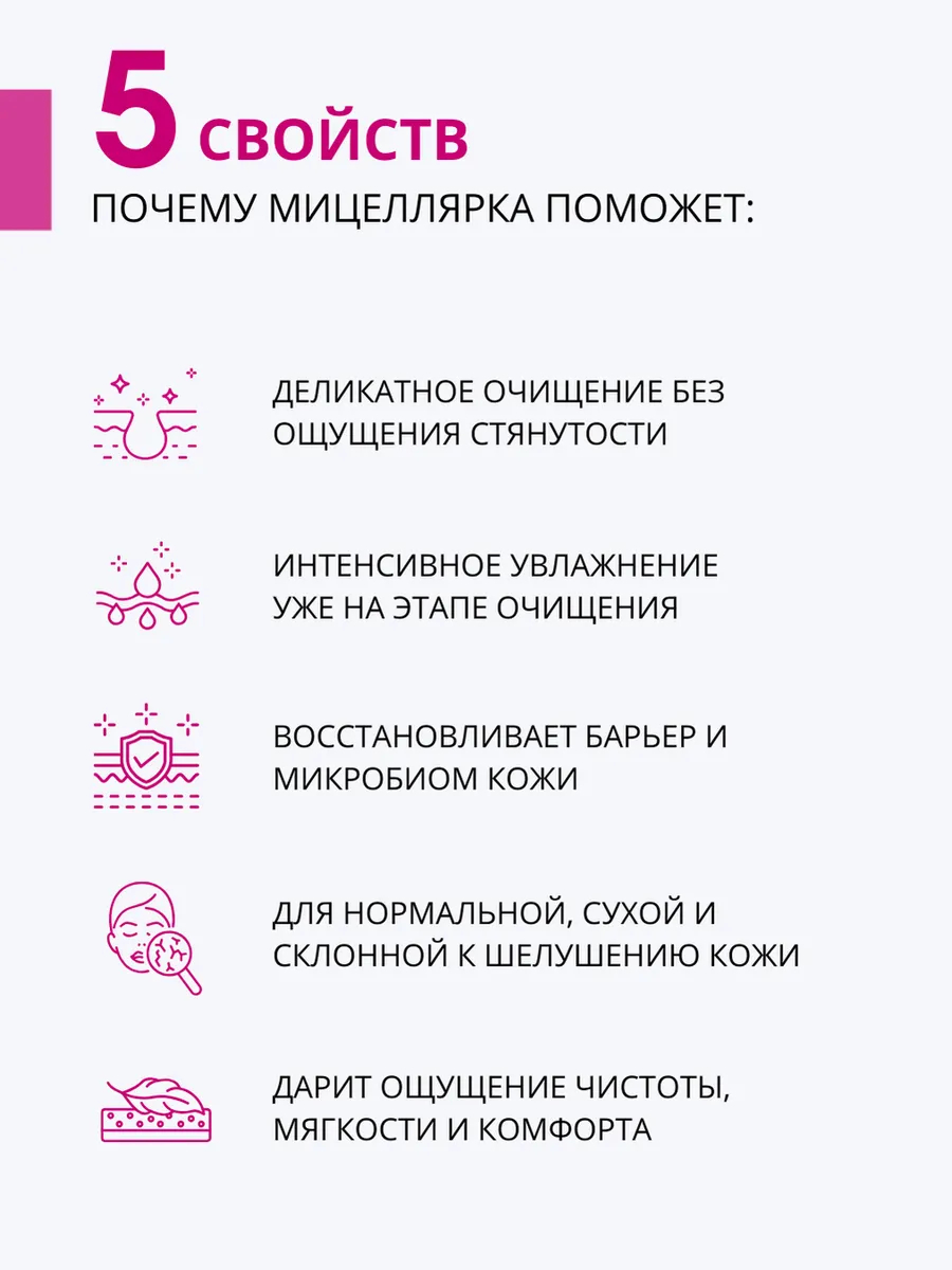 Разработана для деликатного демакияжа. Легко удаляет загрязнения, макияж и избытки себума, бережно очищает, не оставляет липкой пленки, смягчает, увлажняет и успокаивает сухую кожу.