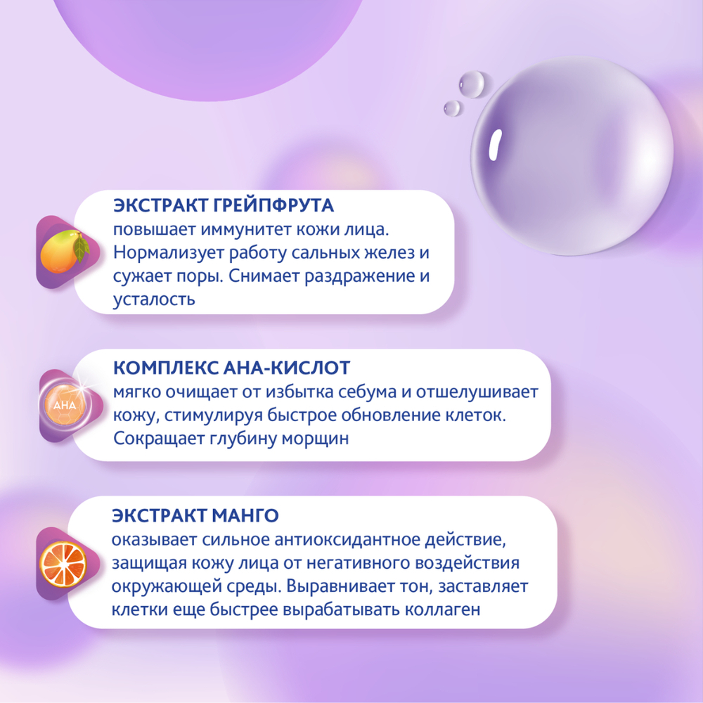 Комплекс АНА-кислот мягко очищает от избытка себума и отшелушивает кожу, стимулируя быстрое обновление клеток. Облегчает проникновение уходовых косметических средств, повышая их эффективность. Сокращает глубину морщин, увлажняет кожу и выравнивает цвет лица.