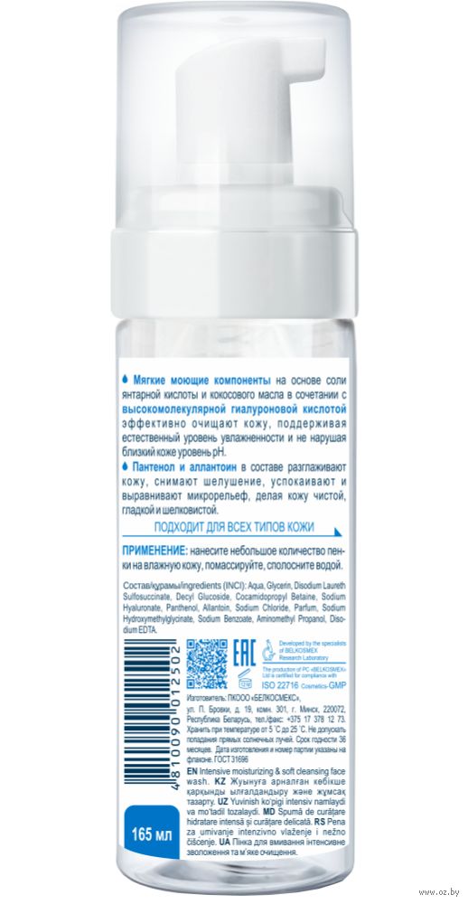 Мягкие моющие компоненты на основе соли янтарной кислоты и кокосового масла в сочетании с высокомолекулярной гиалуроновой кислотой эффективно очищают кожу, поддерживая естественный уровень увлажненности и не нарушая близкий коже уровень pH.