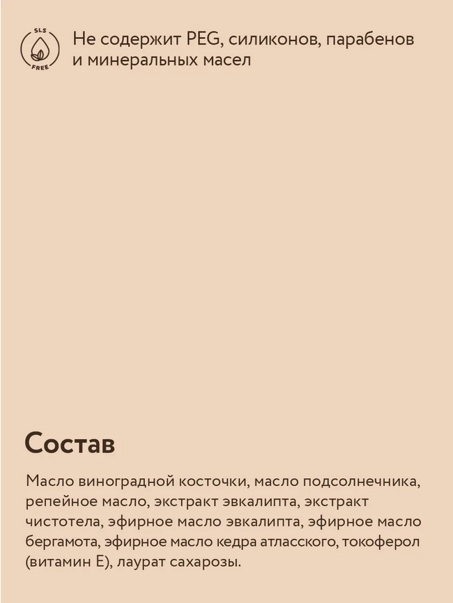 Масло виноградной косточки, масло подсолнечника, репейное масло, экстракт эвкалипта, экстракт чистотела, эфирные масла эвкалипта, бергамота и кедра атласского, витамин Е, лаурат сахарозы.