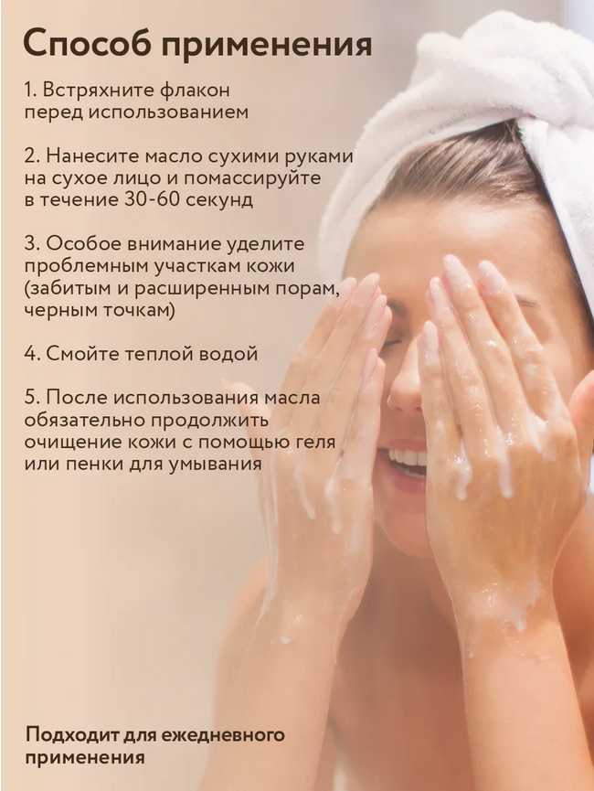 Встряхните флакон перед использованием. Нанесите масло сухими руками на сухое лицо и помассируйте в течение 30-60 секунд. Особое внимание уделите проблемным участкам кожи (забитые и расширенные поры, черные точки). Смойте водой. После использования масла продолжить очищение кожи с помощью геля или пенки для умывания (по желанию).Состав