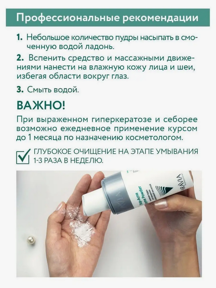 Небольшое количество пудры насыпать в смоченную водой ладонь. Вспенить средство и массажными движениями нанести на влажную кожу лица и шеи, избегая области вокруг глаз. Смыть водой.Состав