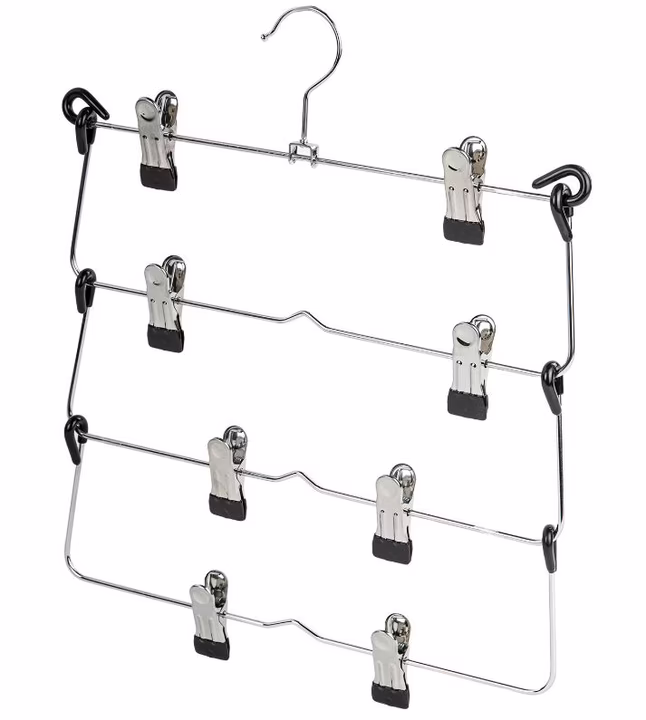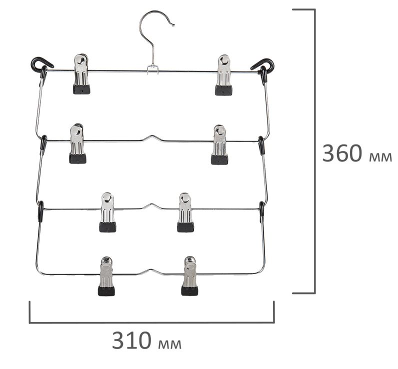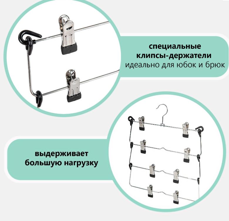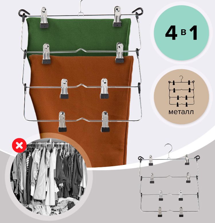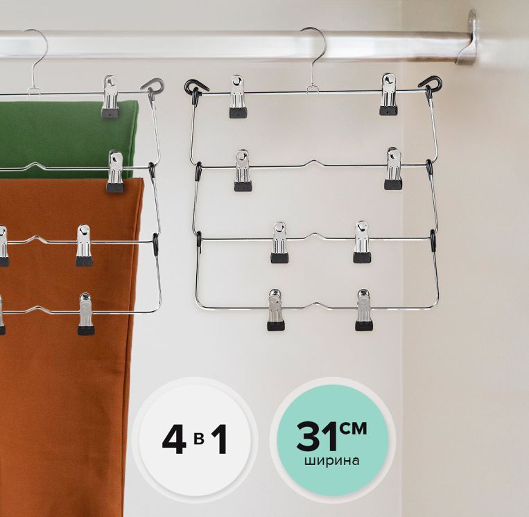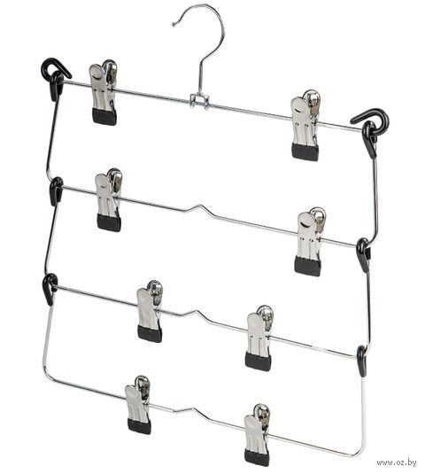 Вешалка-плечики для одежды с клипсами для юбок и брюк. Имеет 4 уровня, что обеспечивает удобство и экономию пространства вашего шкафа или гардеробной. Идеальна для небольших шкафов, фактически заменяет 4 вешалки, но при этом занимает меньший объем.