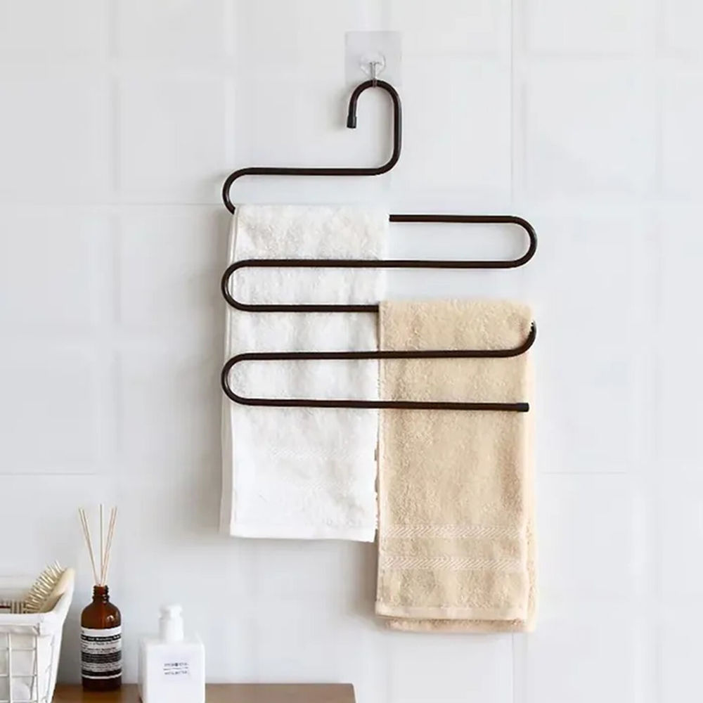 Вешалка для одежды изготовлена из прочного металла. Многоуровневая вешалка для брюк эстетичной изогнутой формы выдерживает до 6 кг благодаря усиленному металлическому профилю. Она не погнется даже под тяжестью зимних штанов или мокрых полотенец. Пластиковые заглушки на концах не позволят соскальзывать одежде с вешалки, а самому аксессуару с перекладины шкафа.