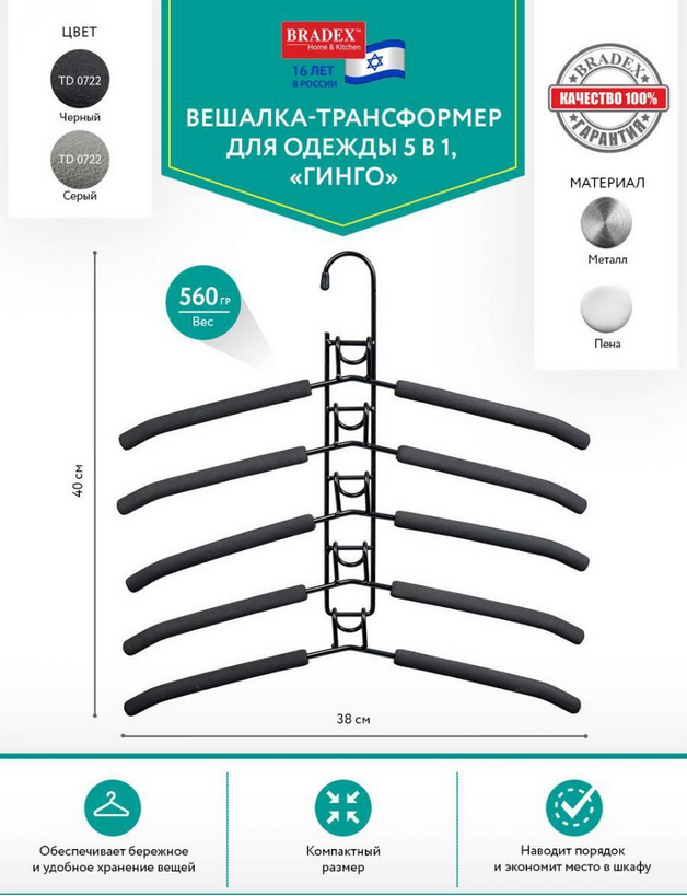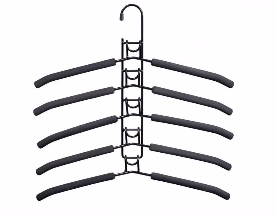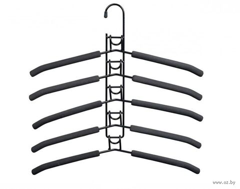 На этой вешалке можно вертикально или горизонтально закрепить 5 плечиков, а саму вешалку разместить на перекладине шкафа, как стандартные плечики.