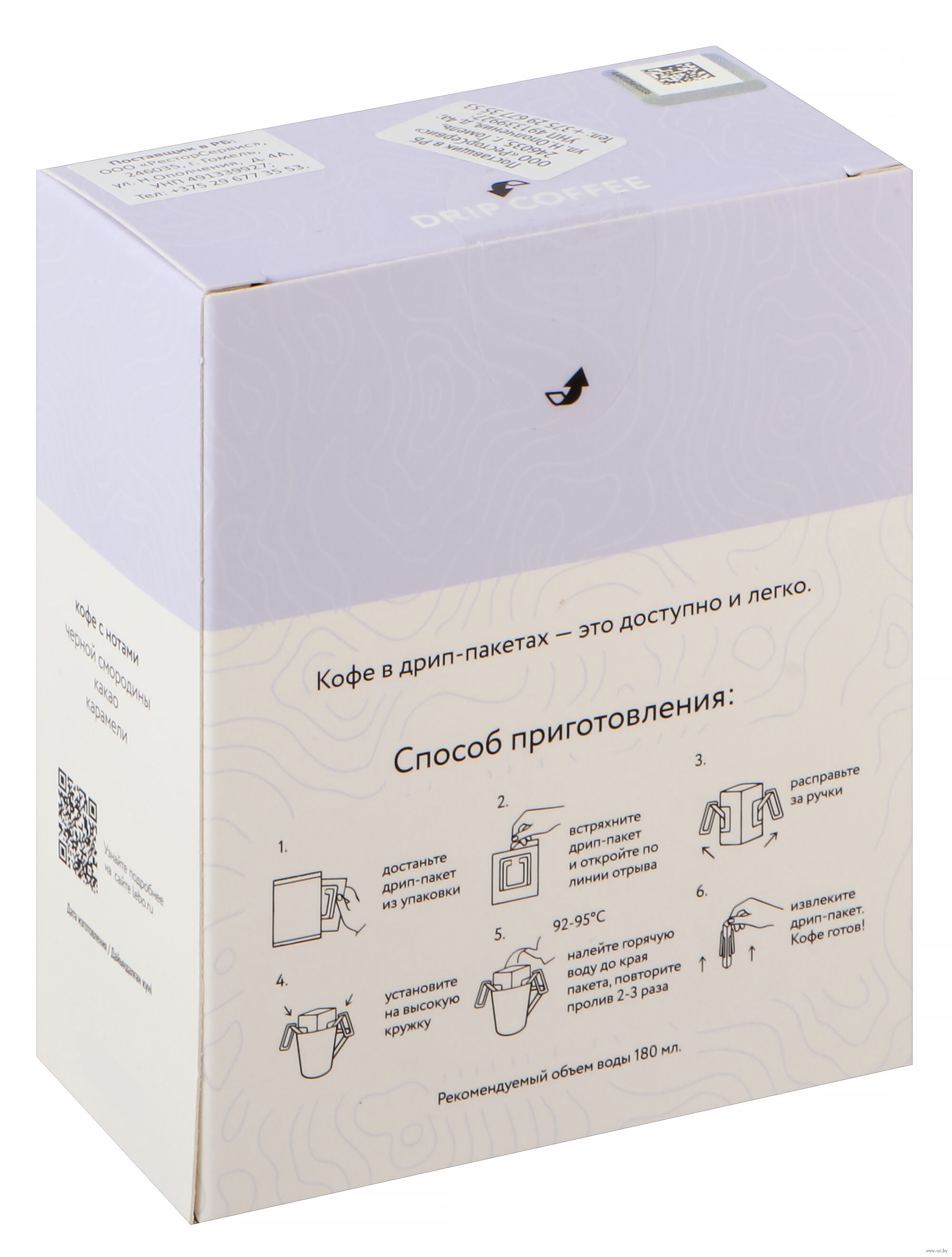 Встряхните дрип-пакет и откройте по линии отрыва. Расправьте за ручки. Установите на высокую кружку. Налейте горячую воду до края пакета (92-95 градусов). Повторите пролив 2-3 раза. Извлеките дрип-пакет. Кофе готов!