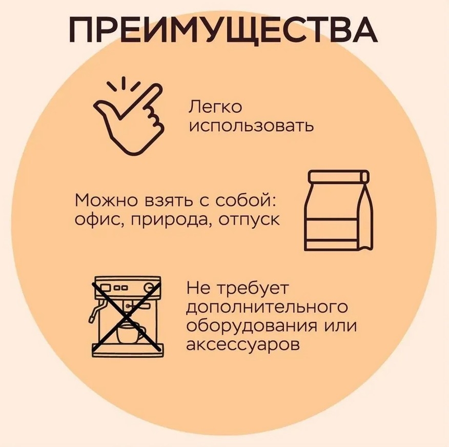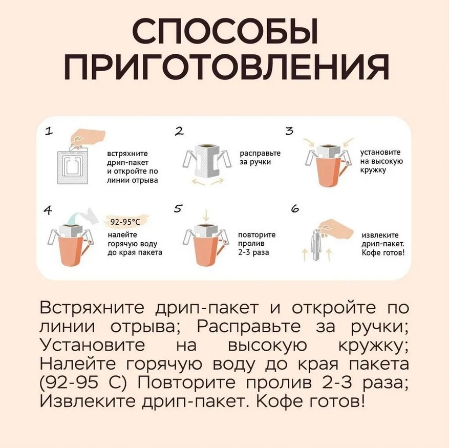 Встряхните дрип-пакет и откройте по линии отрыва. Расправьте за ручки. Установите на высокую кружку. Налейте горячую воду до края пакета (92-95 градусов). Повторите пролив 2-3 раза. Извлеките дрип-пакет. Кофе готов!