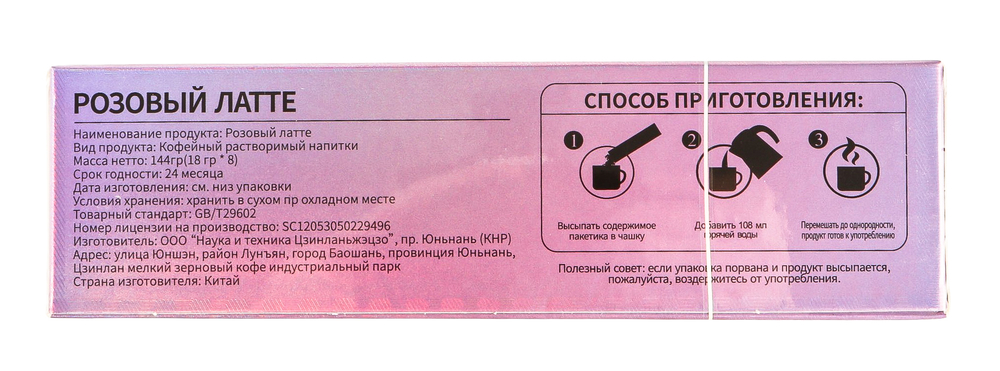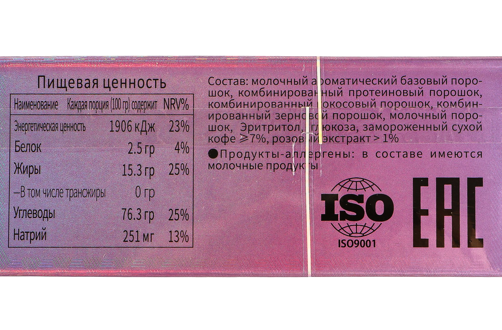 Твердые напитки на основе молочного порошка, твердые напитки на основе сложного белкового порошка, твердые напитки на основе комбинированного кокосового порошка, твердые напитки на основе комбинированного зернового порошка, твердые напитки на основе молочного порошка, моховый спирт, глюкоза, замороженный сухой кофе ≥7%, розовый экстракт > 1%.