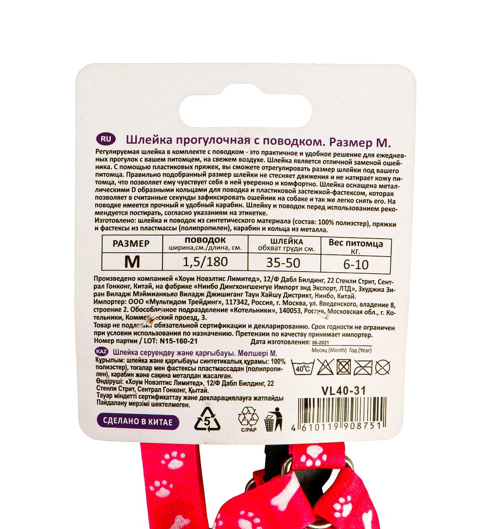 Регулируемая шлейка в комплекте с поводком – это практичное и удобное решение для ежедневных прогулок с вашем питомцем, на свежем воздухе. Шлейка является отличной заменой ошейника. С помощью пластиковых пряжек, вы сможете отрегулировать размер шлейки под вашего питомца. Правильно подобранный размер шлейки не стесняет движения и не натирает кожу питомца, что позволяет ему чувствует себя в ней уверенно и комфортно. Шлейка оснащена металлическими D образными кольцами для поводка и пластиковой застежкой-фастексом, которая позволяет в считанные секунды зафиксировать ошейник на собаке и так же легко снять его. На поводке имеется прочный и удобный карабин. Шлейку и поводок перед использованием рекомендуется постирать, согласно указаниям на этикетке.