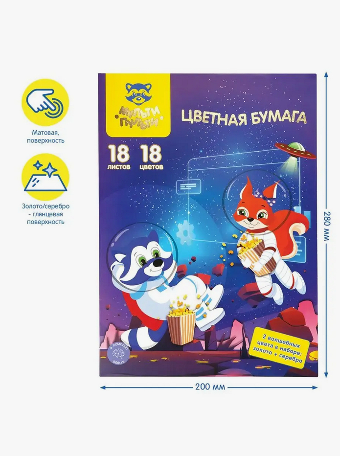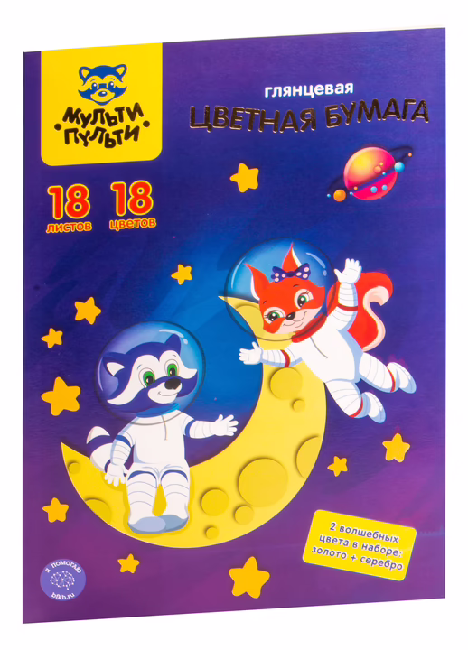 Бумага цветная "Енот в космосе. Волшебная" (А4; 18 листов; 18 цветов; мелованная)