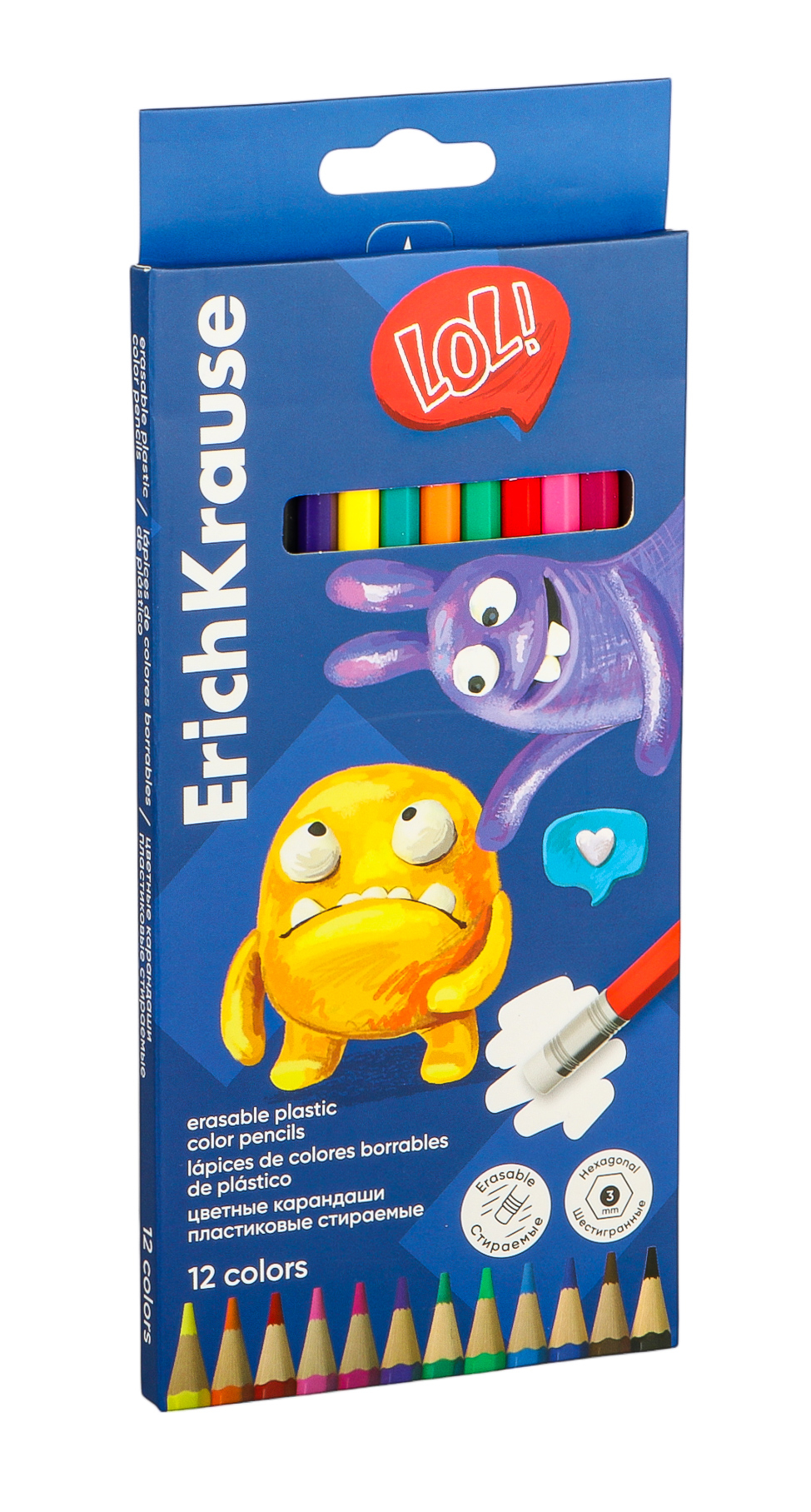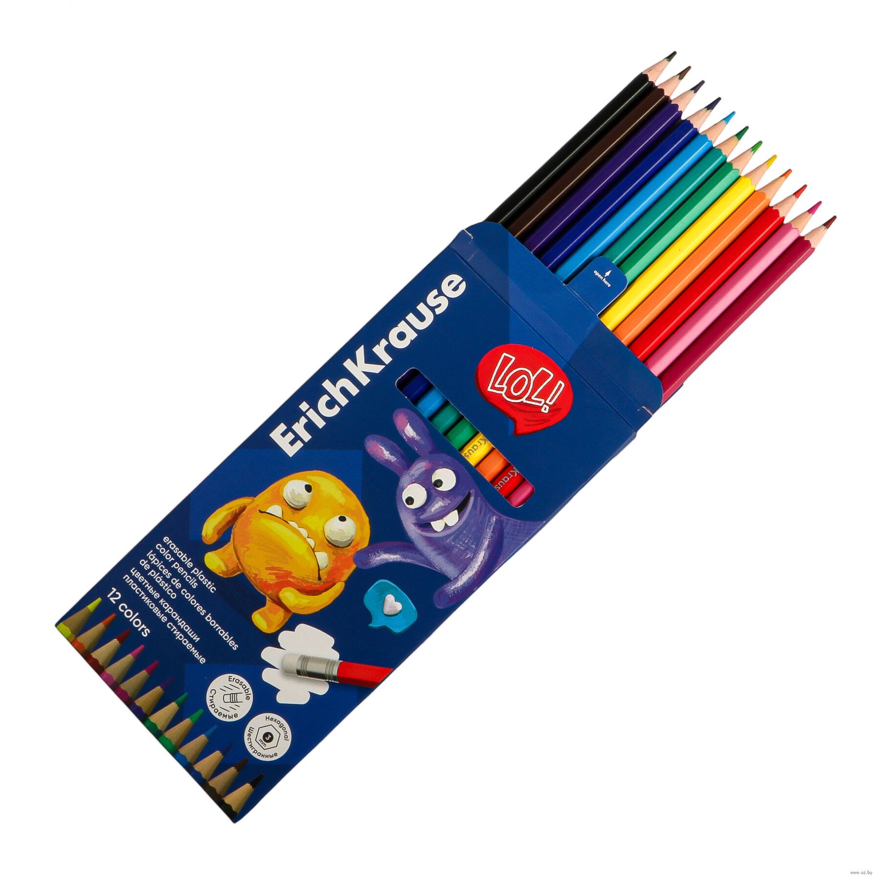 Пластиковые стираемые цветные карандаши с ластиком представлены широкой палитрой оттенков, которые позволяют создавать яркие реалистичные рисунки.
