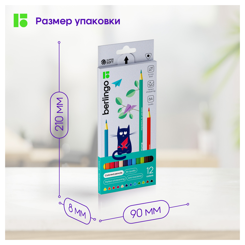 "SuperSoft" – линейка качественно новых цветных карандашей Berlingo. 12 цветов. Эргономичная трехгранная форма. Указание цвета на каждом карандаше на английском языке. Поле для подписи имени владельца на каждом карандаше. Упаковка в плотную матовую картонную коробку со склеенным европодвесом.