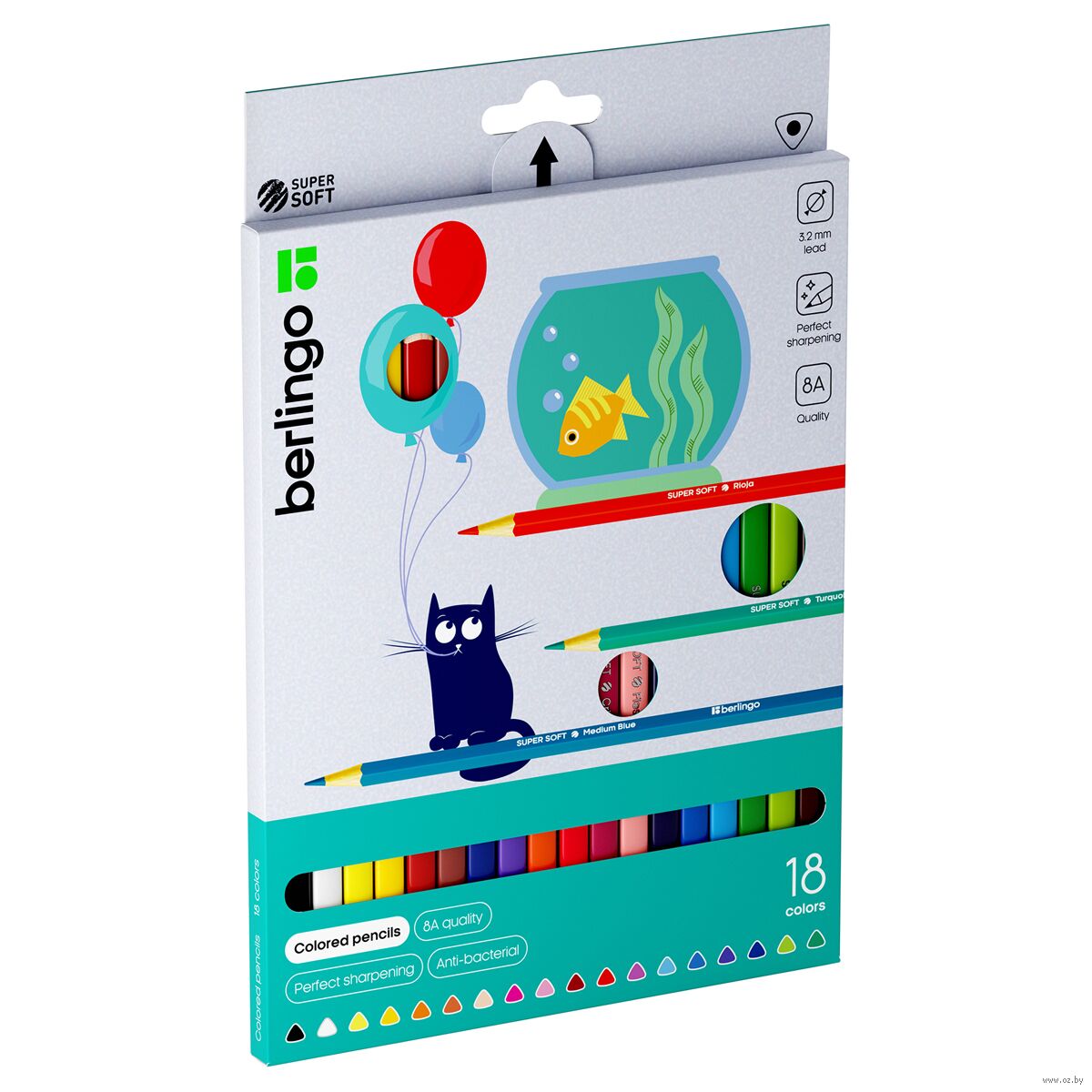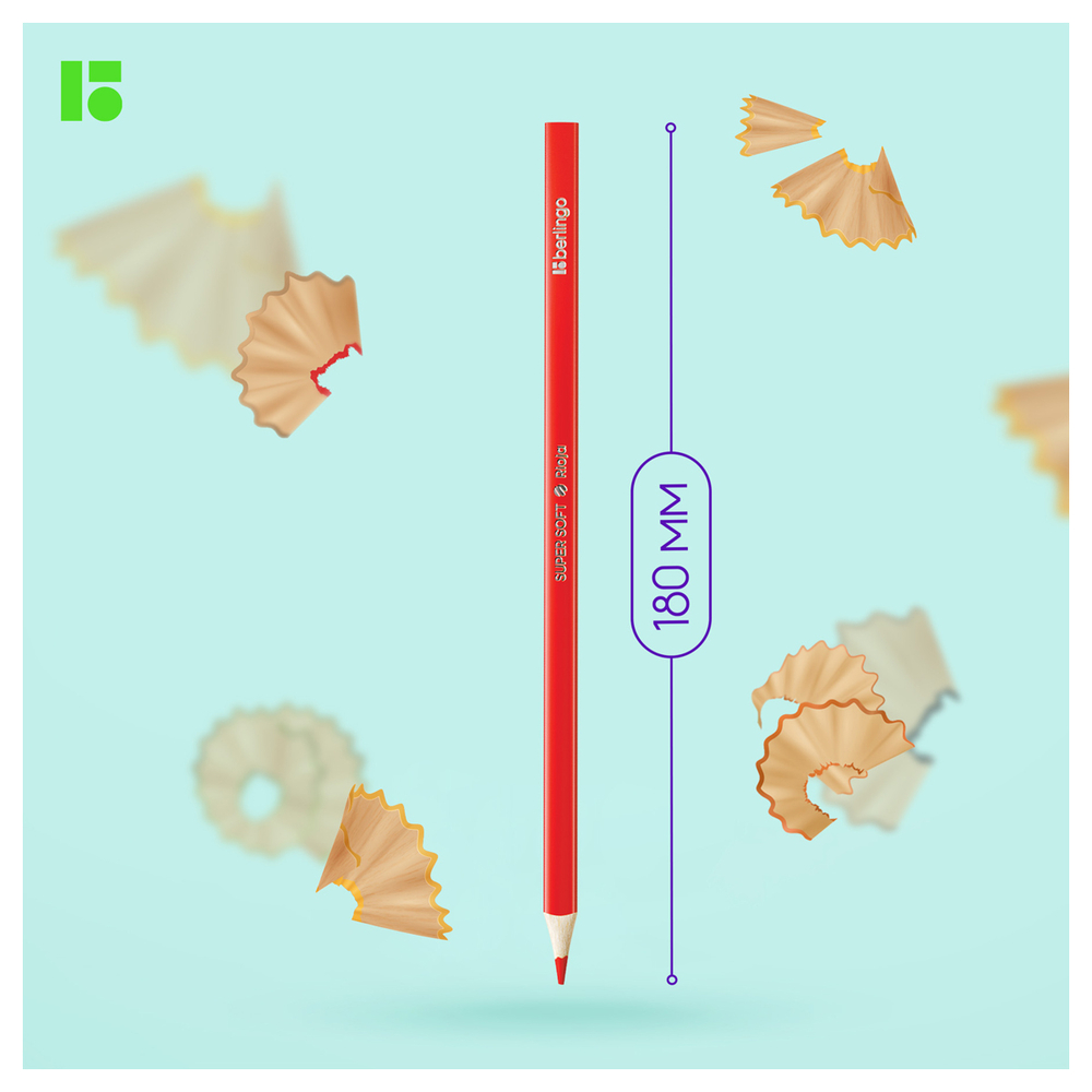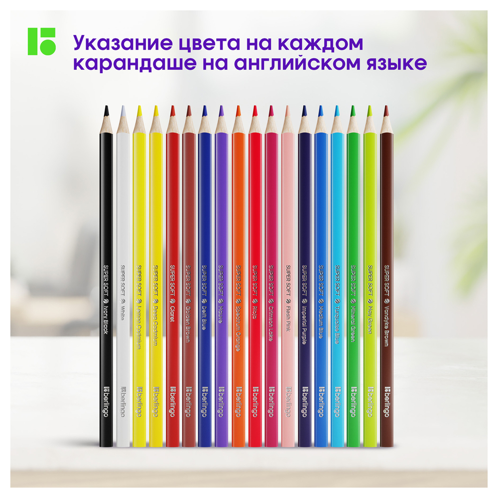"SuperSoft" – линейка качественно новых цветных карандашей Berlingo. 18 цветов. Эргономичная трехгранная форма. Указание цвета на каждом карандаше на английском языке. Поле для подписи имени владельца на каждом карандаше. Упаковка в плотную матовую картонную коробку со склеенным европодвесом. Пластиковый трей внутри предотвращает скатывание карандашей и позволяет легко собирать их в коробку.