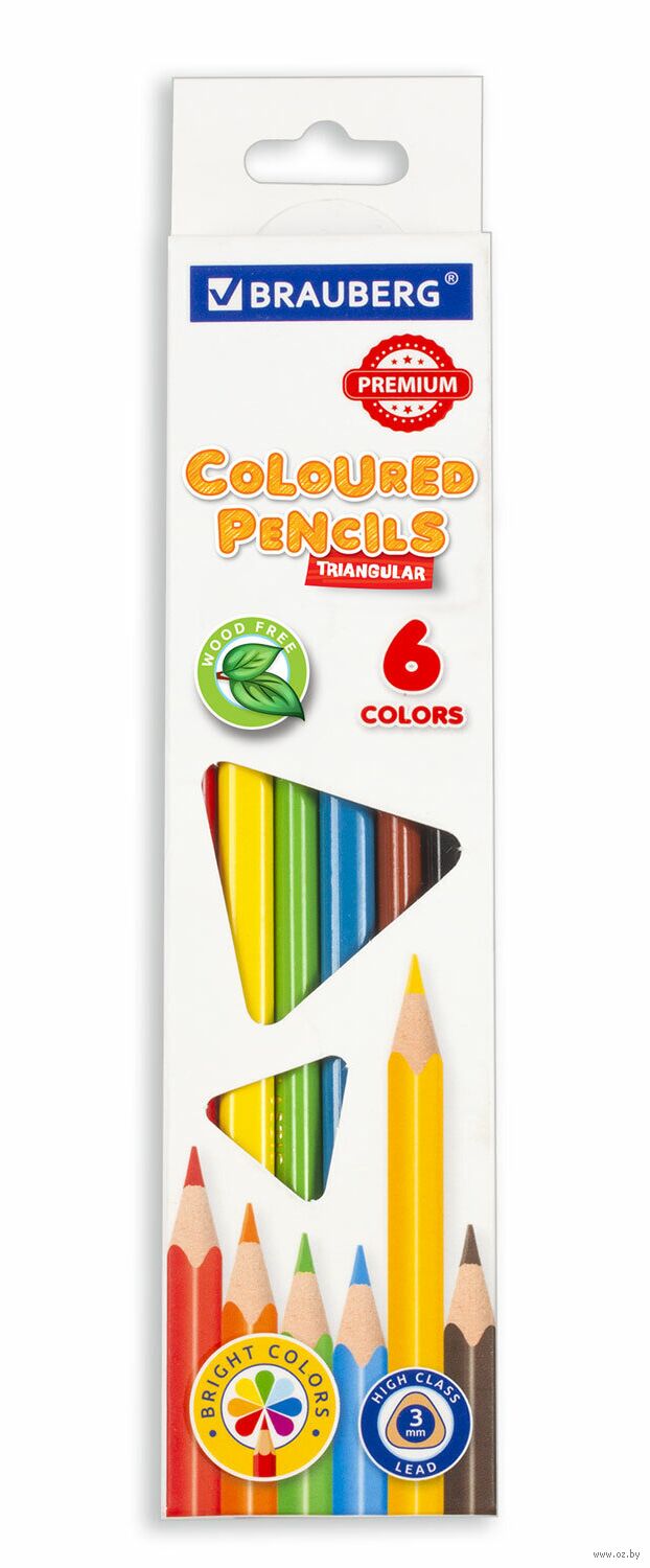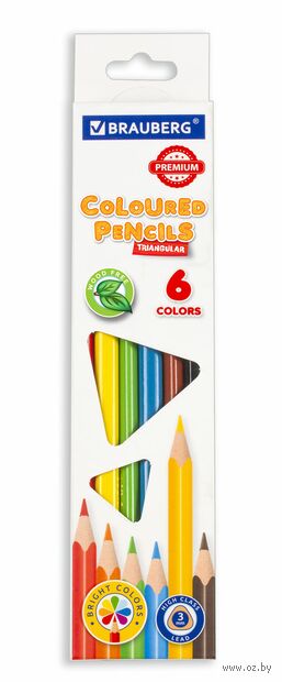 Набор состоит из 6 цветов: красный, желтый, зеленый, голубой, коричневый, черный. Трехгранная форма сечения корпуса позволяет не скатываться карандашу с поверхности стола во время занятий рисованием.