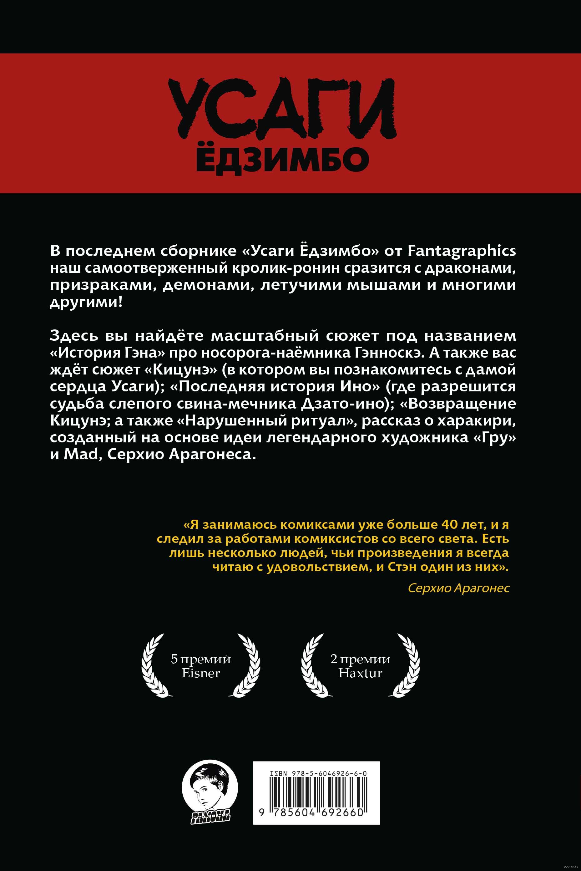 В последнем сборнике Усаги Ёдзимбо наш самоотверженный кролик-ронин сразится с драконами, призраками, демонами, летучими мышами и многими другими! Здесь вы найдёте масштабный сюжет под названием История Гэна про носорога-наёмника Гэнноскэ. А также вас ждёт сюжет Кицунэ (в котором вы познакомитесь с дамой сердца Усаги); Последняя история Ино (где разрешится судьба слепого свина-мечника Дзато-ино); Возвращение Кицунэ; а также Нарушенный ритуал , рассказ о харакири, созданный на основе идеи легендарного художника "Гру" и Mad, Серхио Арагонеса.