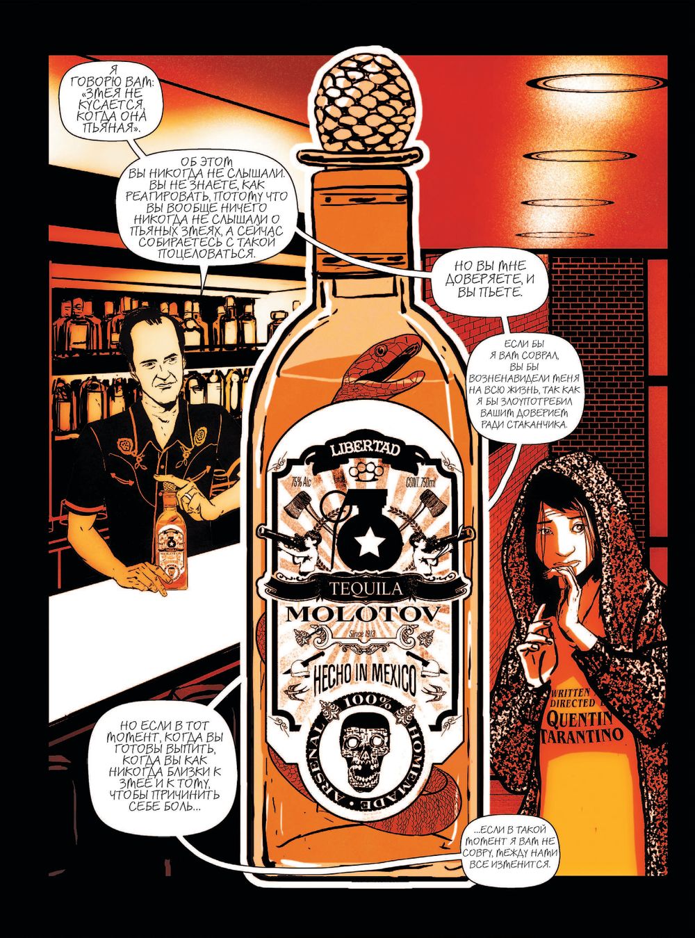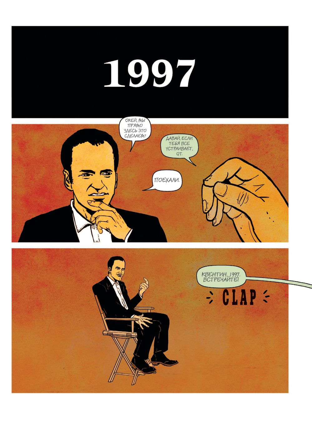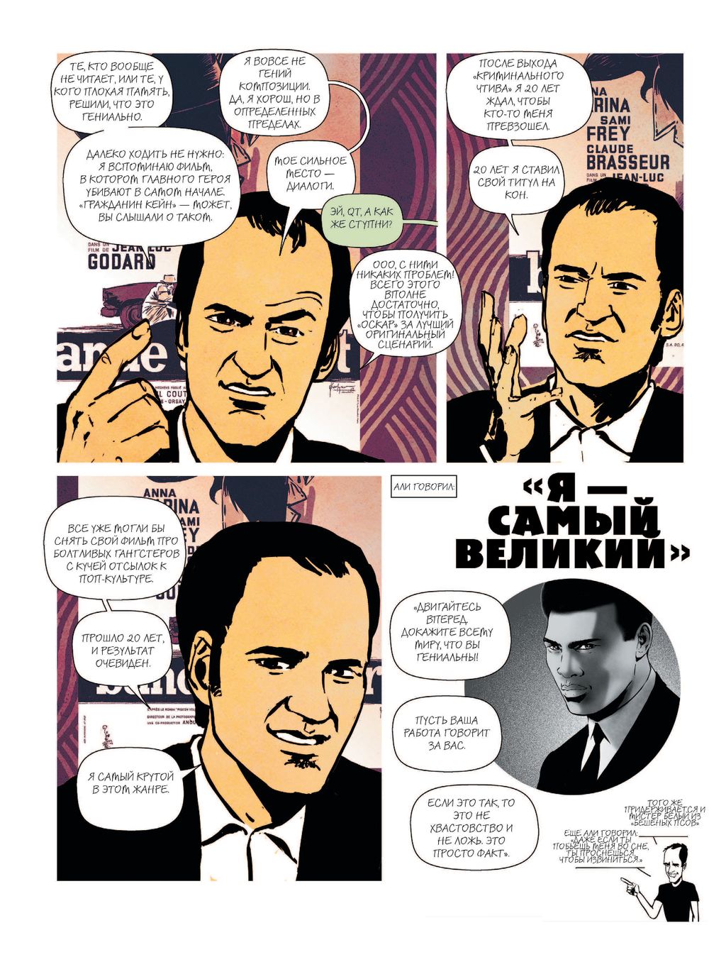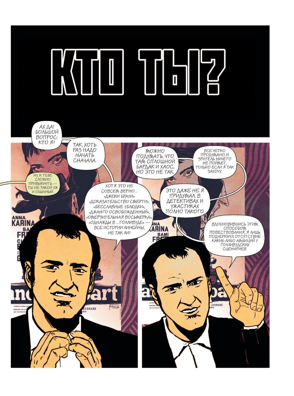 Квентин Тарантино – один из величайших режиссеров современности. Каждый его фильм – настоящий феномен не только в кинематографе, но и в мировой культуре. "Криминальное чтиво", "Убить Билла", "Бесславные ублюдки" – с одной стороны это разные фильмы, но уникальное режиссерское видение Тарантино делает их невероятно похожими друг на друга с точки зрения авторского языка. Но как появился этот оригинальный стиль и почему он так запал в душу зрителю XXI века? Об этом расскажет сам Квентин Тарантино. В формате... комикса! Присаживайтесь поудобнее и погружайтесь в мир гениального режиссера. Но предупреждаем: будет много крови и ругани. В общем, все в лучших традициях Тарантино.
