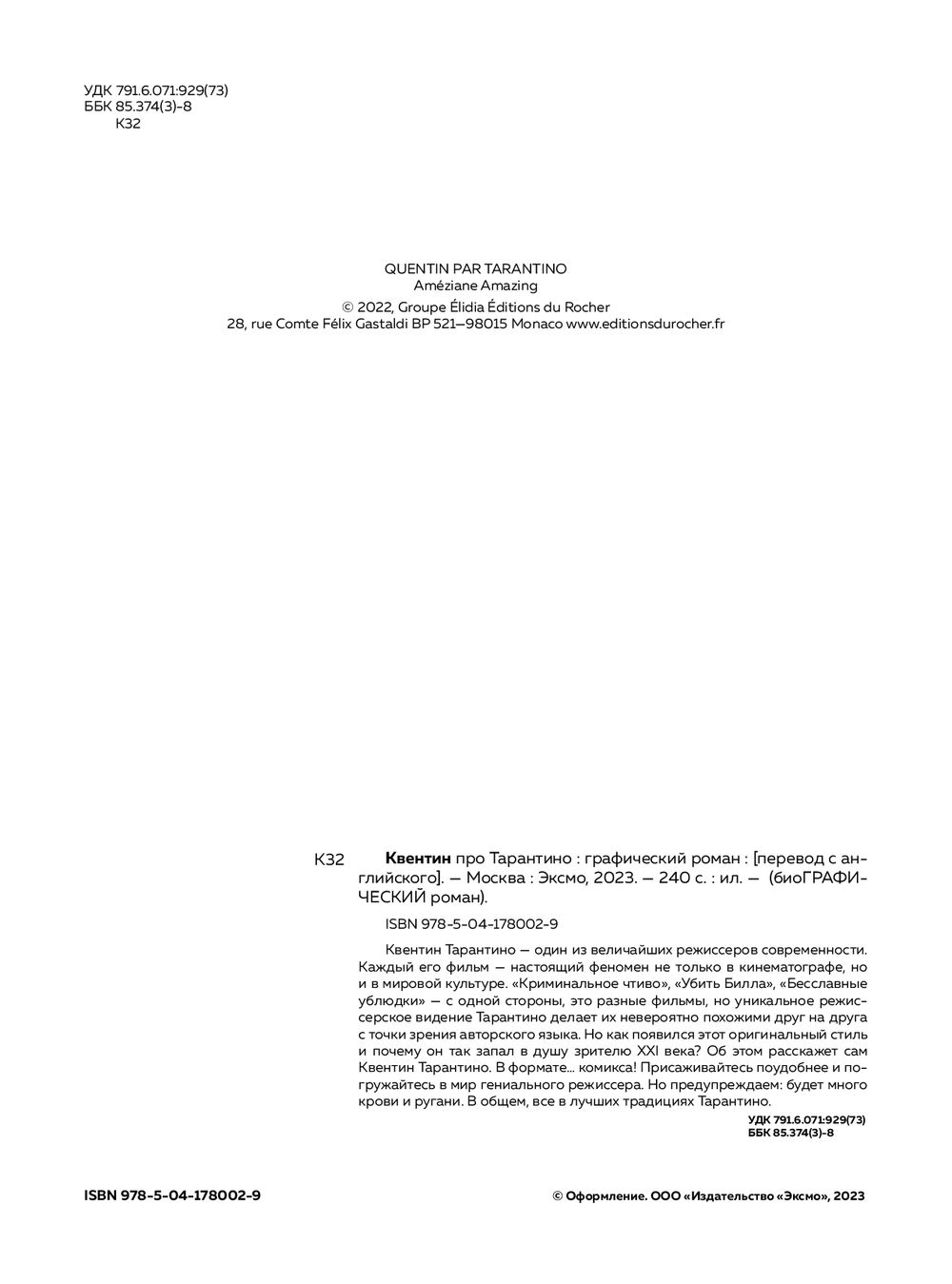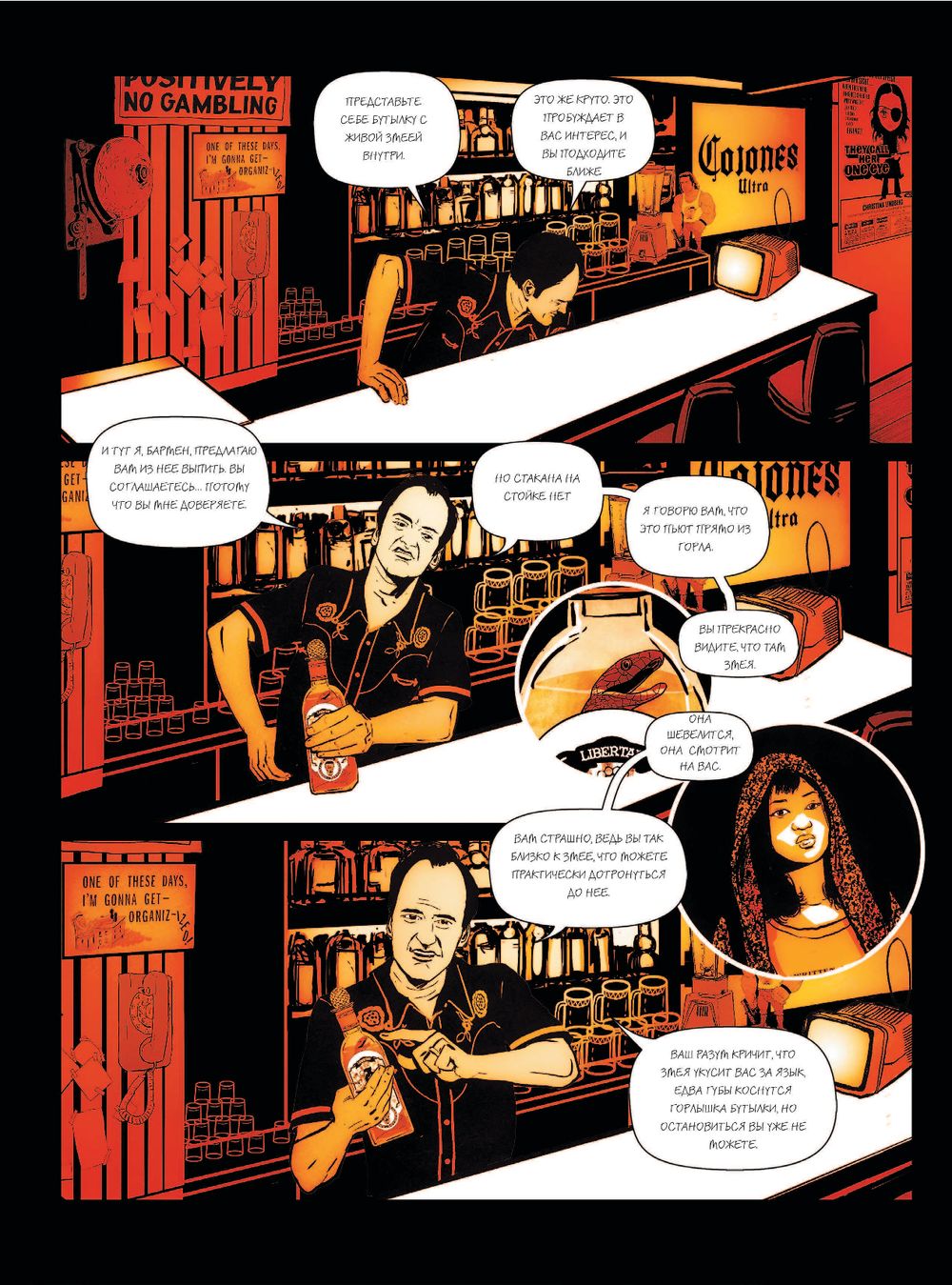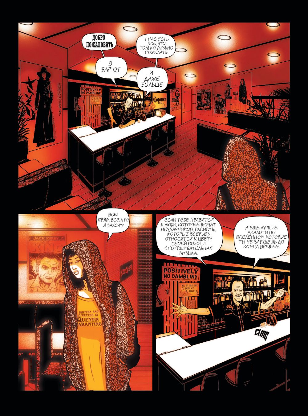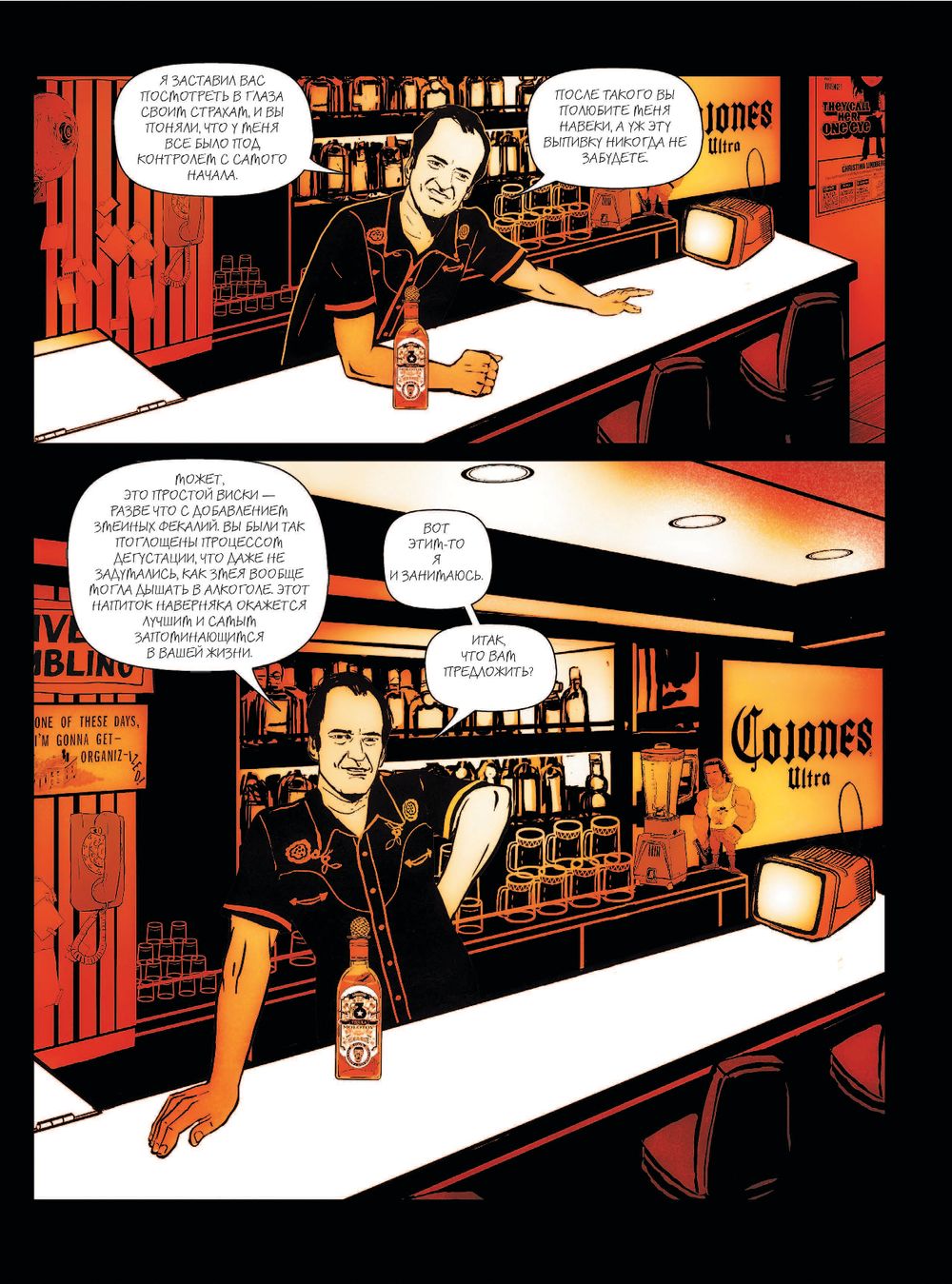 Квентин Тарантино – один из величайших режиссеров современности. Каждый его фильм – настоящий феномен не только в кинематографе, но и в мировой культуре. "Криминальное чтиво", "Убить Билла", "Бесславные ублюдки" – с одной стороны это разные фильмы, но уникальное режиссерское видение Тарантино делает их невероятно похожими друг на друга с точки зрения авторского языка. Но как появился этот оригинальный стиль и почему он так запал в душу зрителю XXI века? Об этом расскажет сам Квентин Тарантино. В формате... комикса! Присаживайтесь поудобнее и погружайтесь в мир гениального режиссера. Но предупреждаем: будет много крови и ругани. В общем, все в лучших традициях Тарантино.