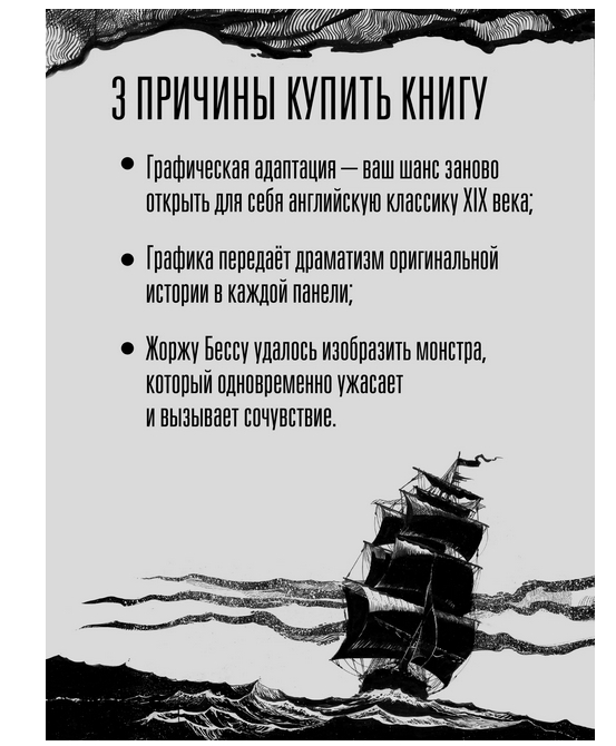 Доктор Франкенштейн мечтал выйти за рамки жизни и побороть смерть, но жестоко поплатился за безрассудство. Трагичная история Прометея XIX века и созданного им монстра стала культовым сюжетом мировой литературы, к переосмыслению которого современные авторы и художники возвращаются снова и снова. Жорж Бесс, настоящий мастер черно-белой графики, ярко передает драматизм знаменитой истории и увлекает читателя в ее готический мир, чтобы еще раз задаться вопросом о сущности человека, границах его возможностей и задуматься о последствиях игры с природой.