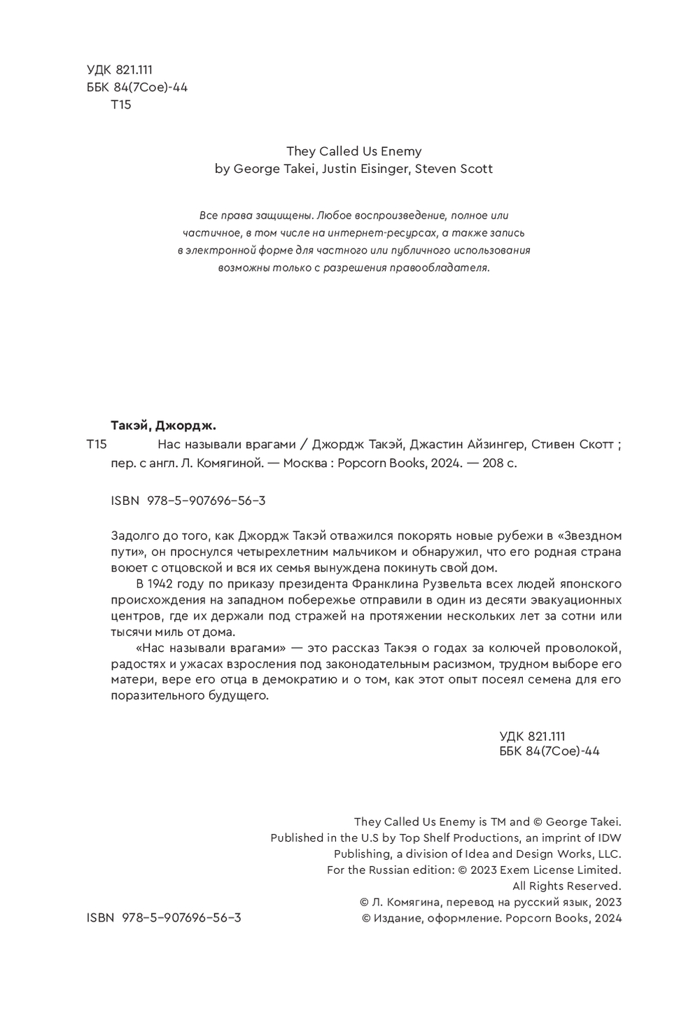 "Нас называли врагами" – это рассказ Такэя о годах за колючей проволокой, радостях и ужасах взросления под законодательным расизмом, трудном выборе его матери, вере его отца в демократию и о том, как этот опыт посеял семена для его поразительного будущего.