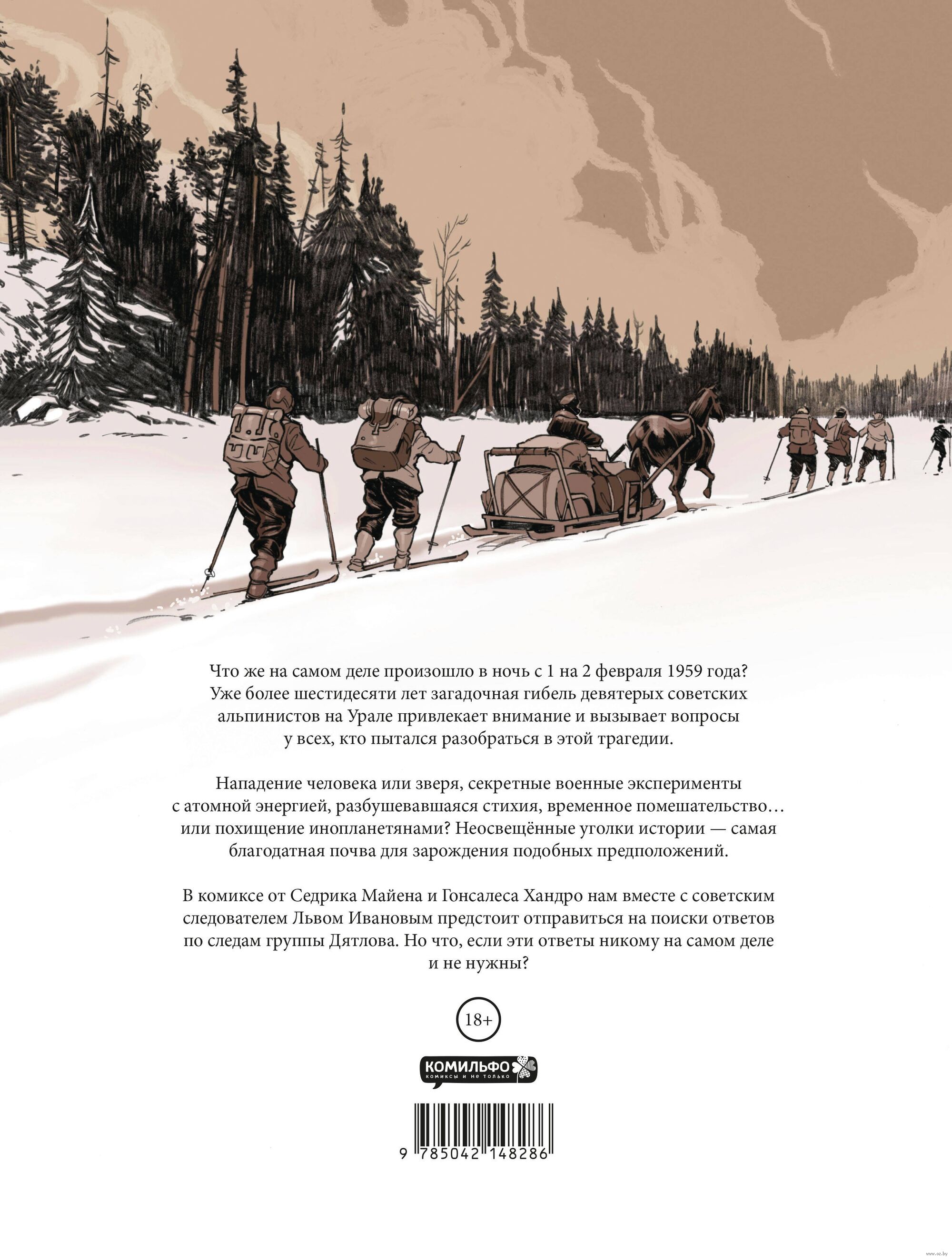 В комиксе от Седрика Майена (сценарий) и Гонсалеса Хандро (рисунок и цвет) нам вместе с советским следователем Львом Ивановым предстоит отправиться на поиски ответов по следам группы Дятлова. Но что, если эти ответы никому на самом деле и не нужны?