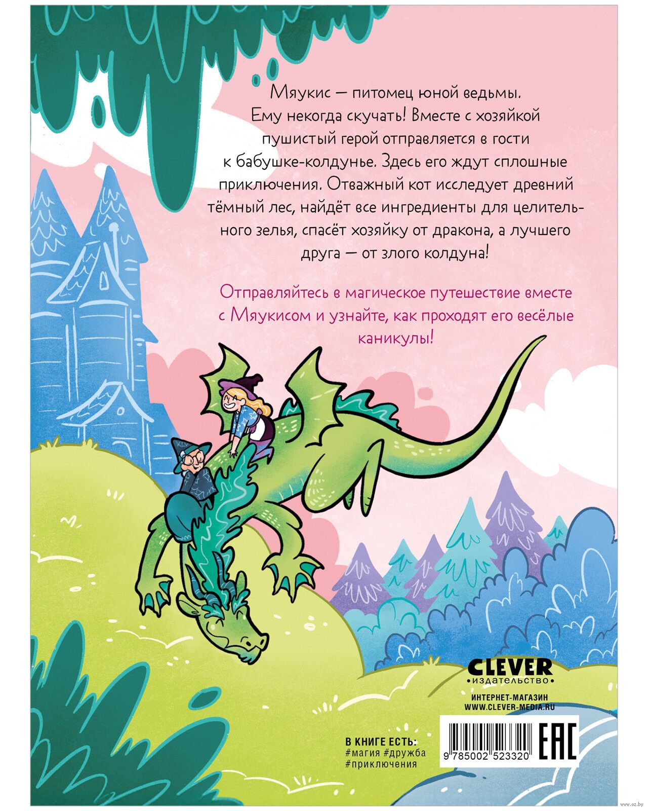 Мяукис – кот юной ведьмы. Ему некогда скучать! Вместе с хозяйкой пушистый герой отправляется в гости к бабушке-колдунье. Здесь его ждут сплошные приключения. Отважный кот исследует древний темный лес, найдет все ингредиенты для целительного зелья, спасет хозяйку от дракона, а лучшего друга – от злого колдуна. Отправляйтесь в магическое путешествие на страницах Clever книги вместе с Мяукисом и узнайте, как проходят его веселые каникулы!