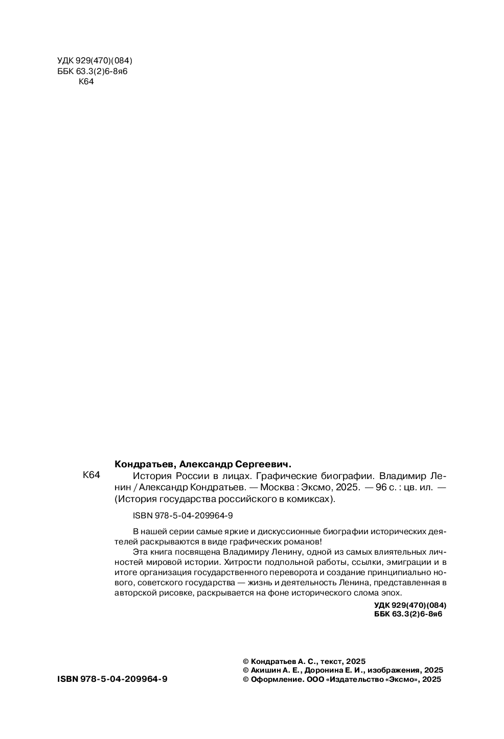 Эта книга посвящена Владимиру Ленину, одной из самых влиятельных личностей мировой истории. Хитрости подпольной работы, ссылки и эмиграции, и в итоге – организация государственного переворота и создание принципиально нового, советского государства – жизнь и деятельность Ленина, представленная в авторской рисовке, раскрывается на фоне исторического слома эпох.
