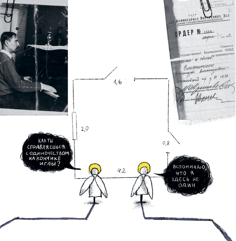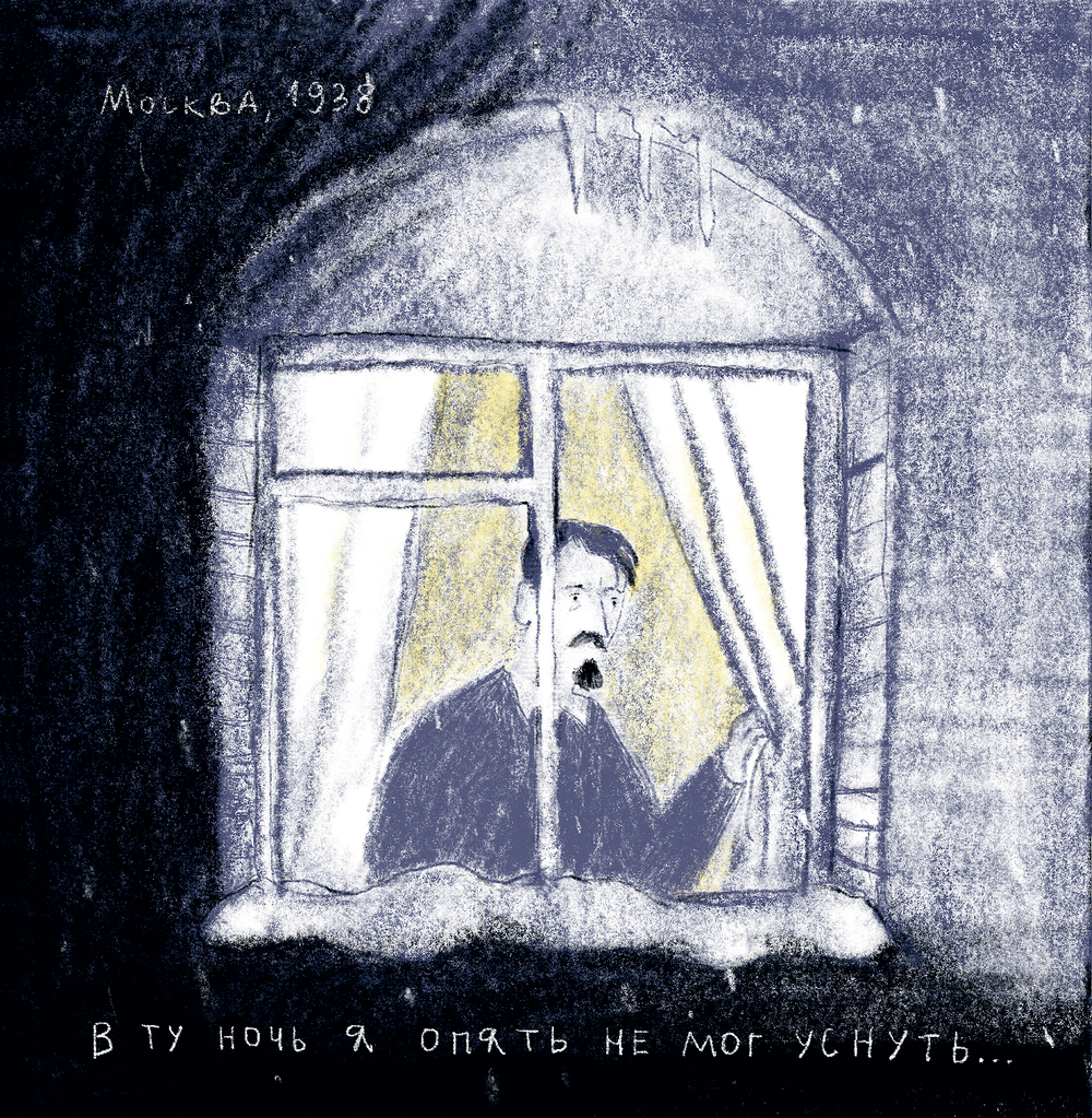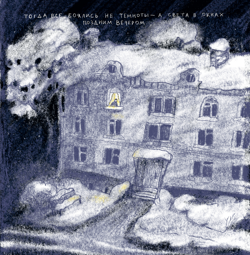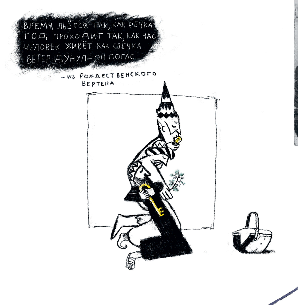 Однажды в семейном архиве он нашел старую, написанную прадедом Александром Смирнитским в 1913 году статью "К вопросу о вырождении вертепной драмы" и коробку с реквизитом для домашних спектаклей. И вспомнил рассказы, которые слышал уже от деда, – о том, как однажды весенней ночью 1938 года за его отцом пришли и увели в неизвестном направлении на долгие годы. Переживания ребенка, глядящего на опечатанную дверь комнаты своего папы, распаковались в ковидно-изоляционном 2020 году вместе с архивом и превратились теперь в новые истории. А те, в свою очередь, – в эту графическую новеллу, нарисованную аниматором-экспериментатором Юрой Богуславским.