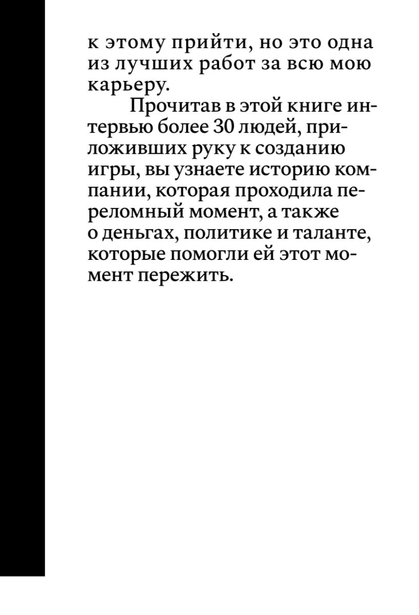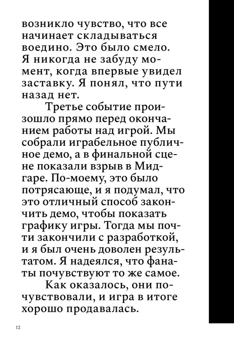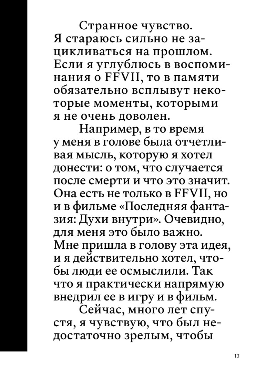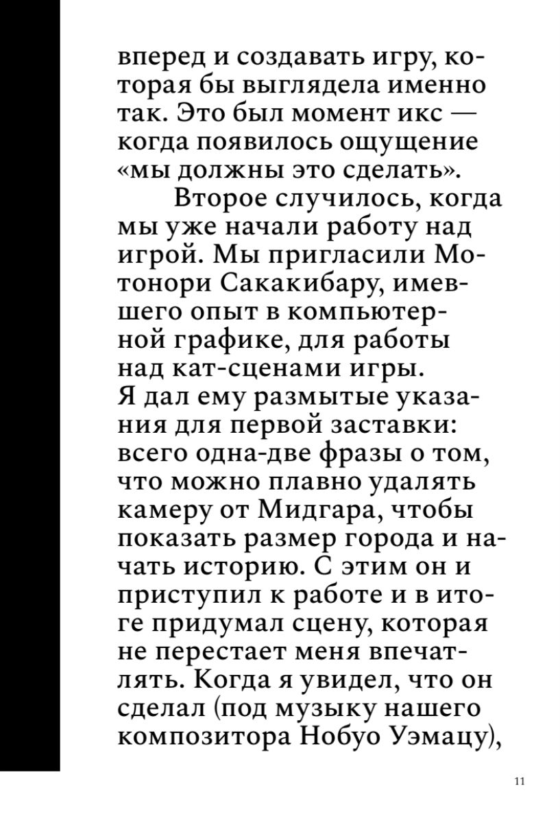 В книге представлена расширенная и улучшенная версия материала, добавлены еще 8 полноценных интервью сотрудников Square и их партнеров, а также иллюстрации и монохромные портреты в стиле манги от диджитал-художников Киото. Погрузившись в увлекательную историю создания легендарной игры, вы из первых уст узнаете: