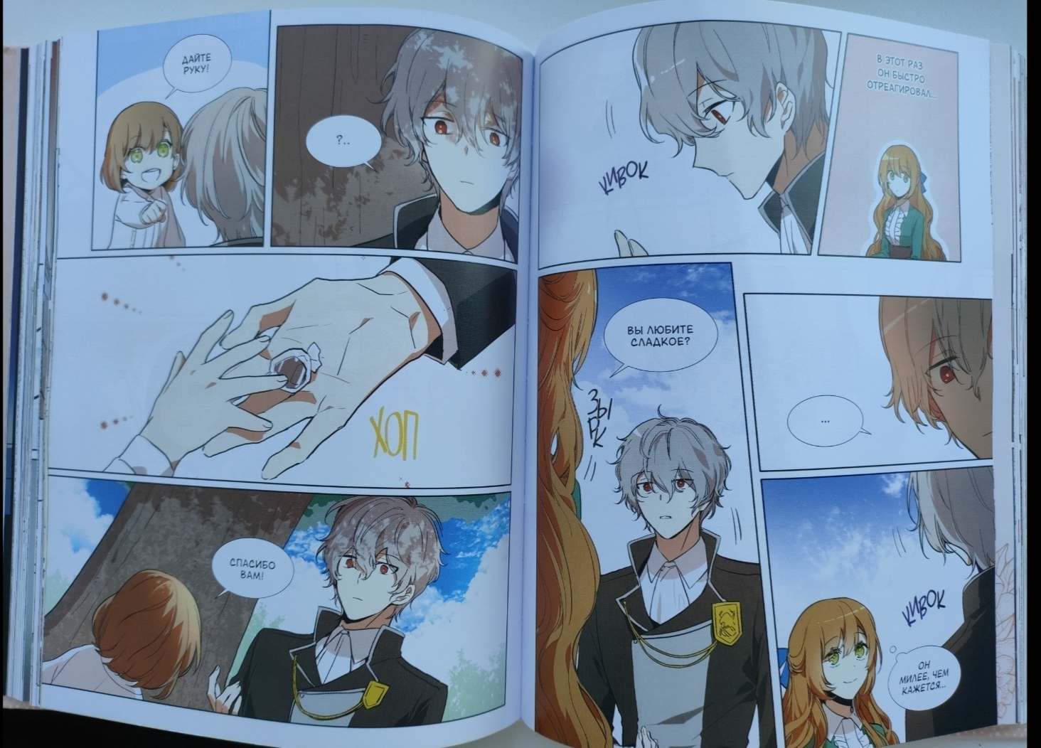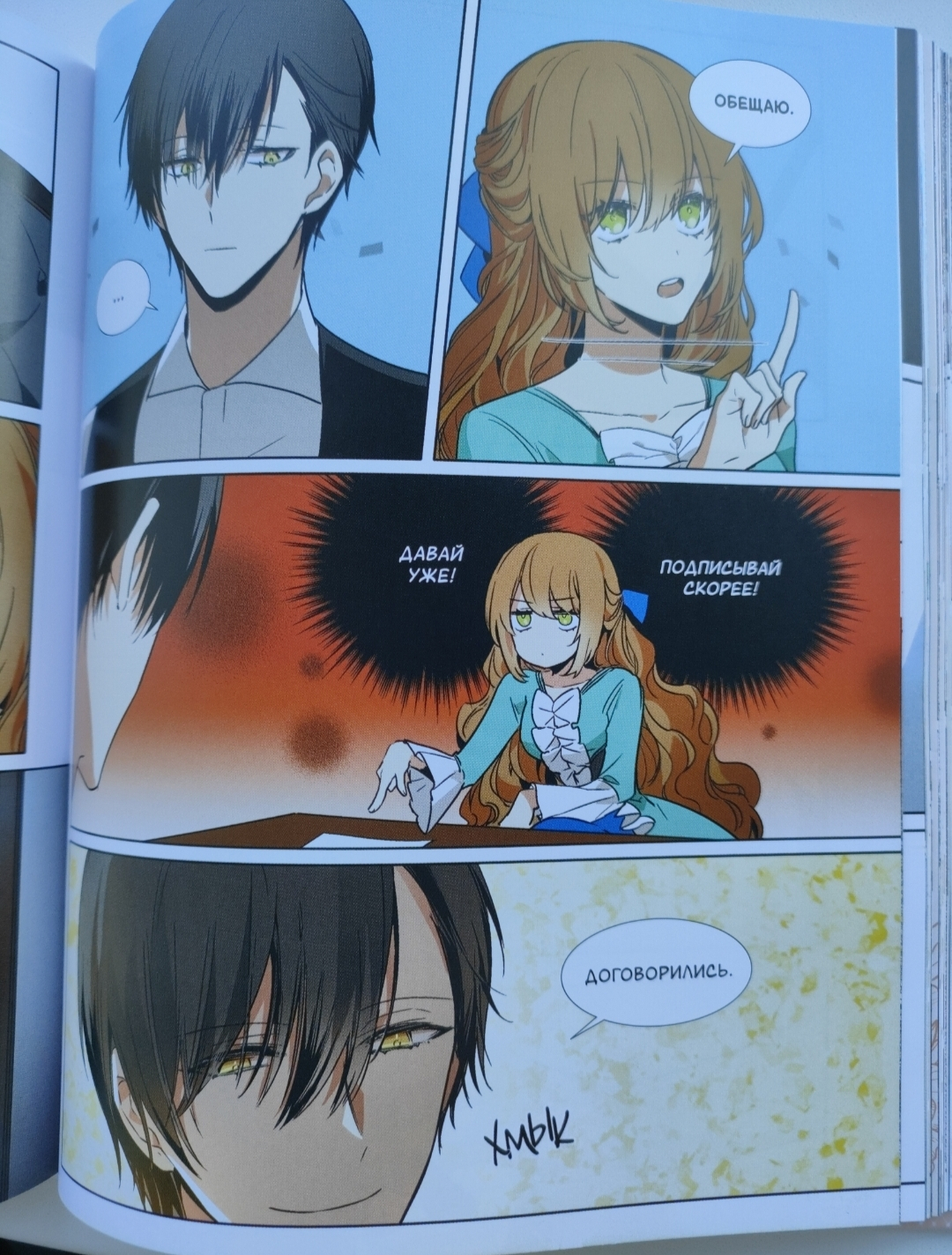 Первая исекай манхва в официальном русскоязычном издании! Манхва внешне очень красивая, часть с рисунком на обложке глянцевая, а мини рамочка с металлическим блеском. По сравнению с самим вебтуном фреймы выглядят более тёмными. Если в версии вебтуна Лери имеет довольно светло русые волосы, то в печатном варианте они значительно темнее. Некоторые сцены из-за этого менее выразительны. Так же можно обратить внимание на обзеранность некоторых нижних фреймов. Если фрейм находится в низу страницы и не ограничен рамочкой, а заканчивается вместе с краем листа, то при сравнении с изначальной версией в 99,9% случае у него будет обрезан нижний край. Если на некоторых фреймах это не так заметно, то на других (особенно фрейм с первым испугом и паникой героини от попадания в новое тело) сильно рубит изначальную картинку. Перевод не вызывает у меня никаких нареканий. Прочтя предварительно манхву в фанатском переводе это не будет вызвать у Вас отторжения. Буду с нетерпением ожидать остальные 8 томов