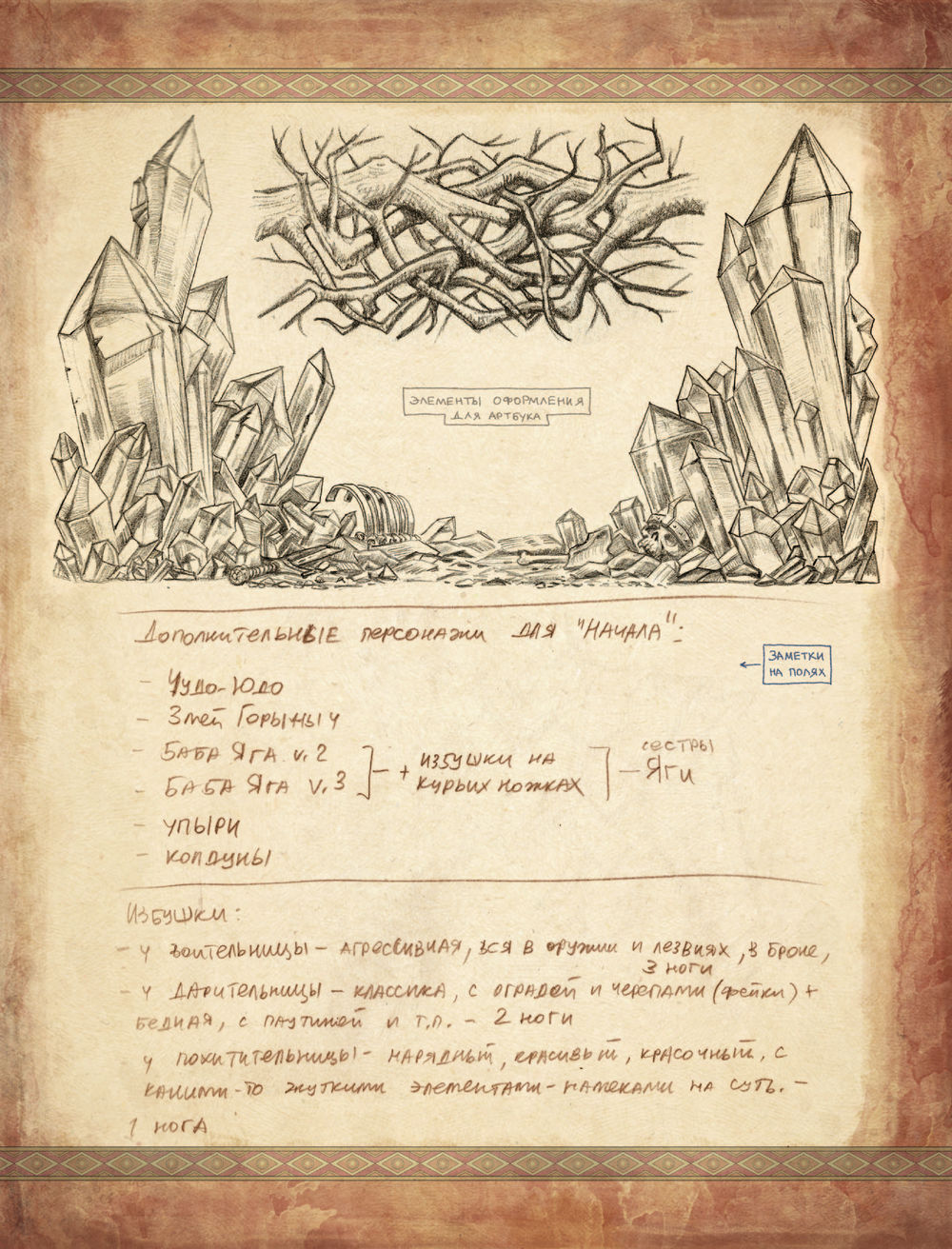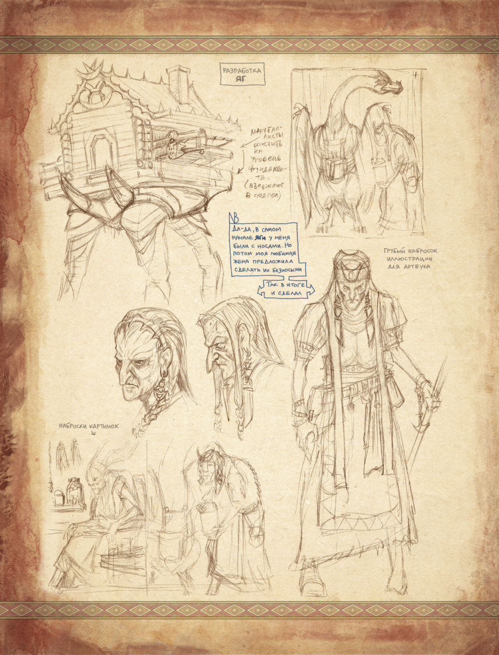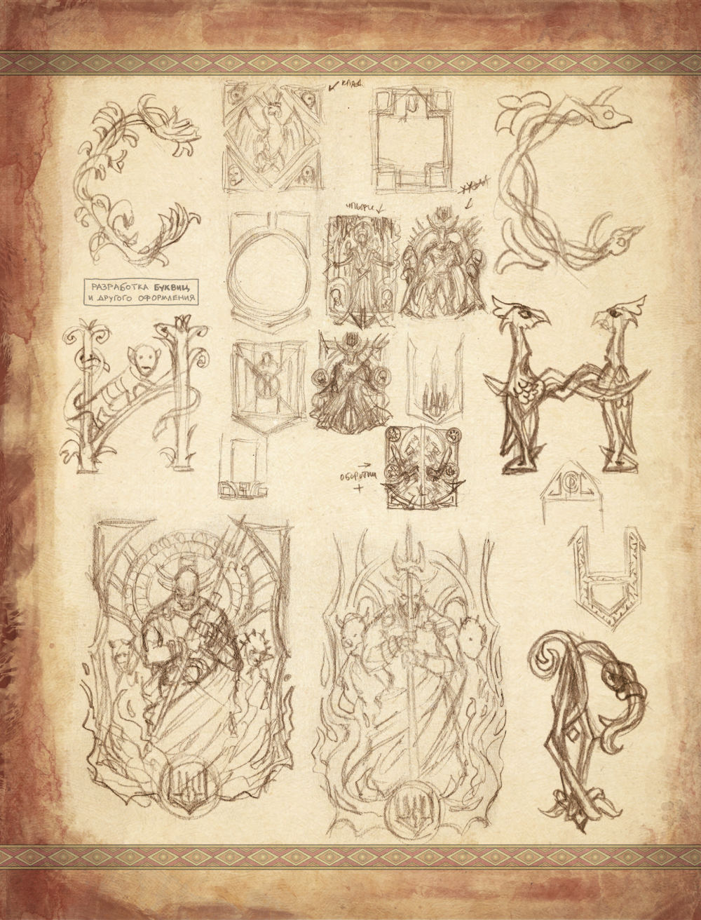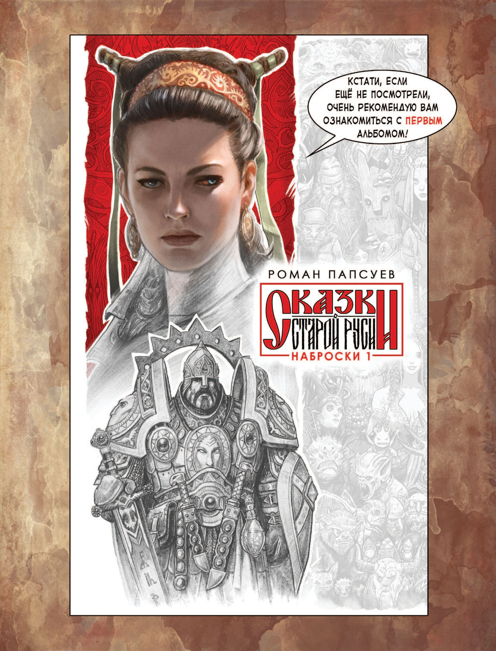 Поэтому решили издать их отдельным сборником. В него вошли эскизы известных работ Романа Папсуева и много нового: от грубых "почеркушек" и "записок на полях" до детально отрисованных иллюстраций, которые попали в финальные макеты артбуков.