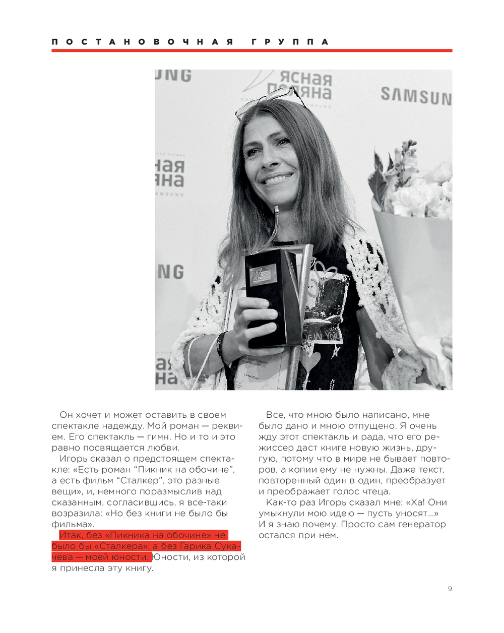 Книга погружает вас в закулисный мир и рассказывает, сколько невероятных артистов разных жанров, от режиссера-постановщика цирка «du Soleil» Павла Брюна до артистов театра кукол имени С. В. Образцова, работали над постановкой, сколько любви и труда вложено в то, чтобы история ожила на сцене.