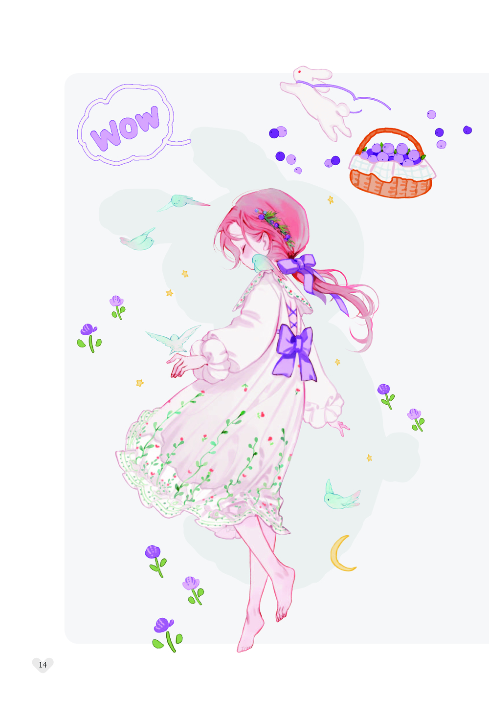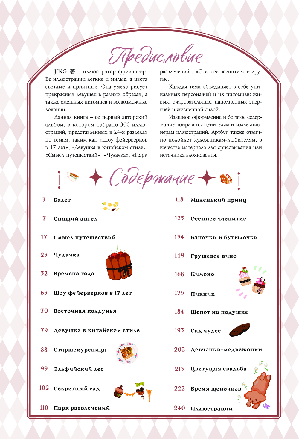 Данная книга – это первый авторский артбук китайской художницы-фрилансера JING. В издание вошло 300 иллюстраций, которые были распределены по 24 темам, таким как "Шоу фейерверков", "Сад чудес", "Смысл путешествий", "Парк развлечений", "Осеннее чаепитие" и др. Каждый раздел демонстрирует уникальный дизайн персонажей, наполненных энергией и жизненной силой.