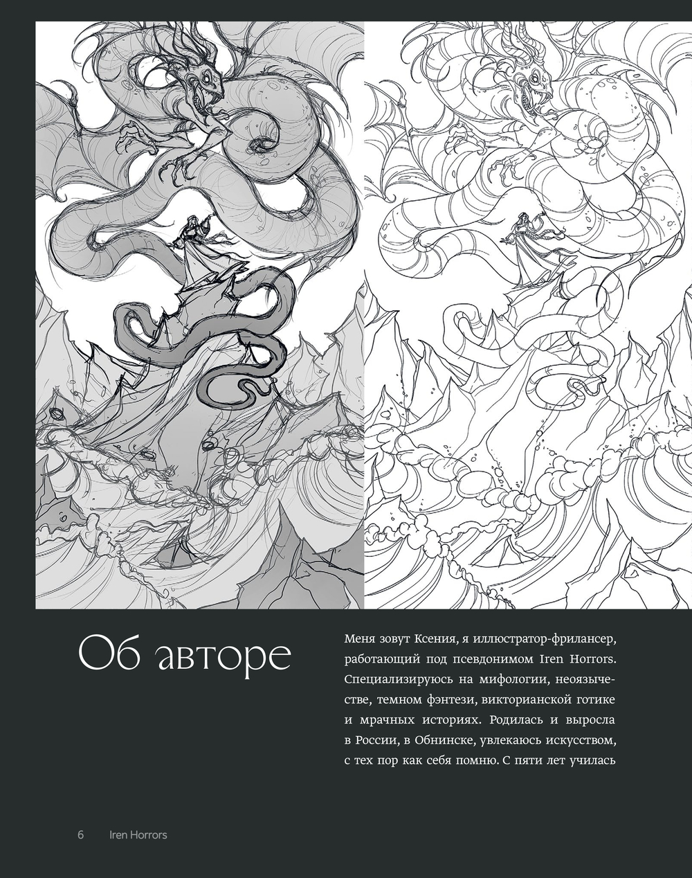 Артбук Iren Horrors – это артбук-настроение, артбук-вдохновение. И особое волшебство мрачной красоты в любое время года, где таинственный голос зовет заглянуть в неизведанное, кто-то наблюдает за путниками из самых темных уголков или таится в заброшенных замках, глубоких водах и непроходимых зарослях...