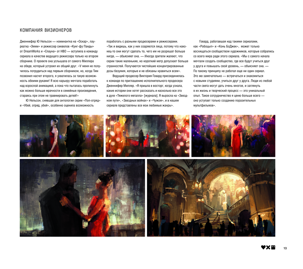 В этой роскошной книге вы познакомитесь с богатством художественных работ и историй, лежащих в основе создания трех сезонов сериала. Особый интерес представляют интервью с ключевыми художниками и креативщиками, такими как создатели сериала Тим Миллер и Дэвид Финчер. Артбук до краев наполнен истинным визуальным пиршеством: от концепт-артов, разработок персонажей, эскизов костюмов, дизайнов транспортных средств, раскадровок до финальных кадров. Идеальный выбор для любого поклонника анимации, кино и графики.