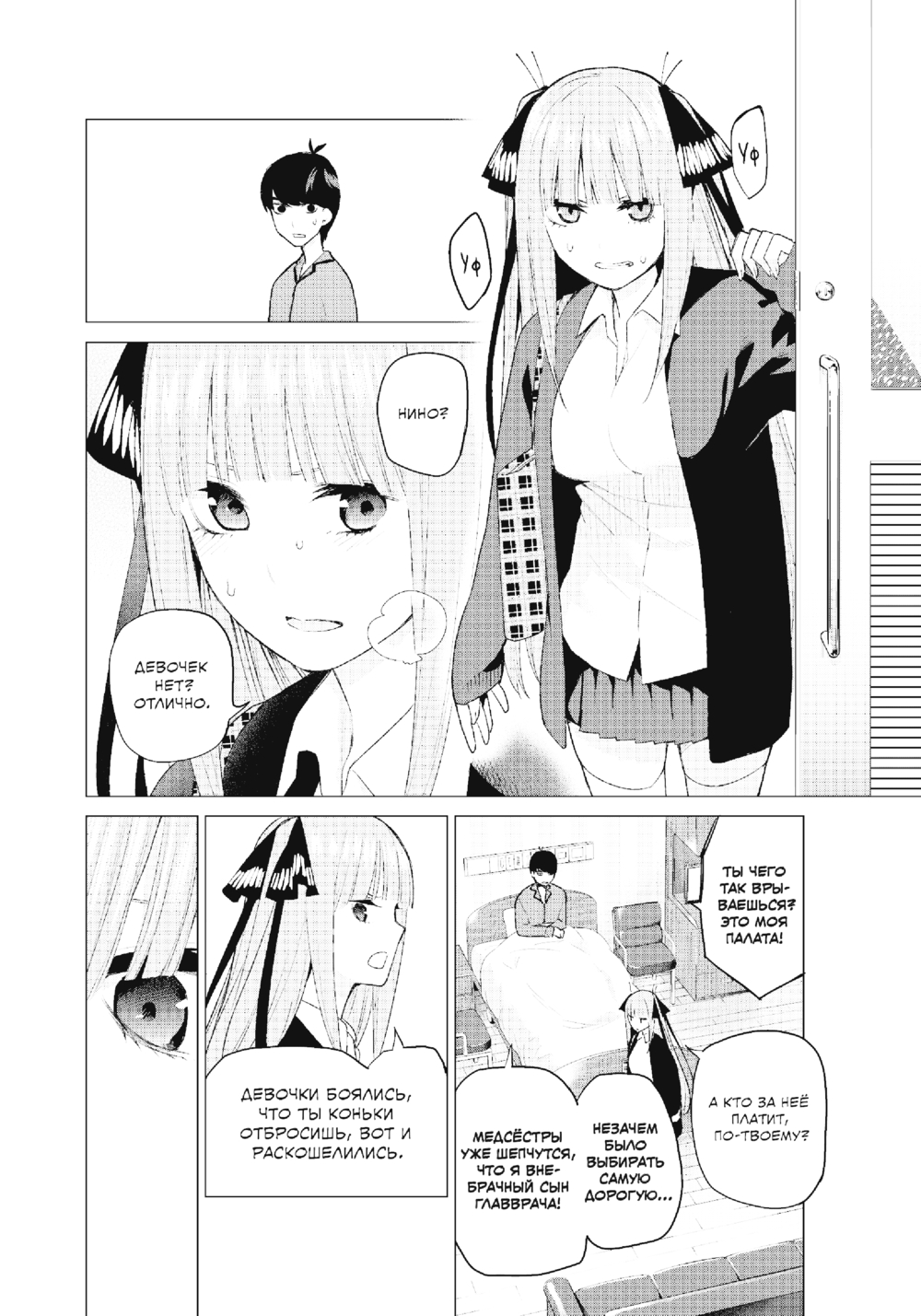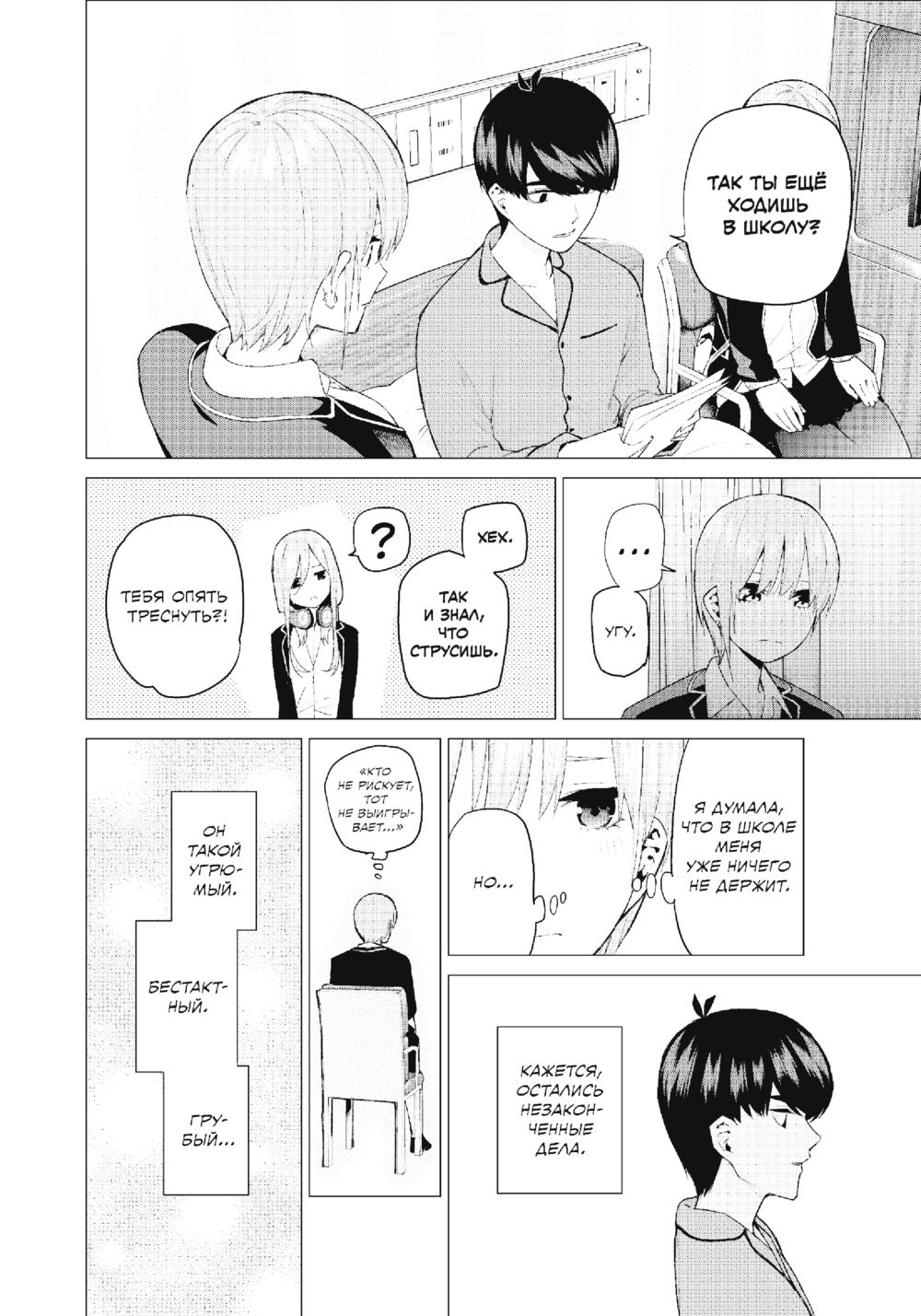 С пятерняшками не соскучишься: что ни день, то новые горести и радости. Нино и Ицуки серьёзно ссорятся и обе уходят из дома. Нино селится в отеле, а Ицуки у Футаро. Футаро пытается их помирить и заодно рассказывает Нино про таинственную девочку из своего прошлого, после встречи с которой он стал совсем другим человеком...