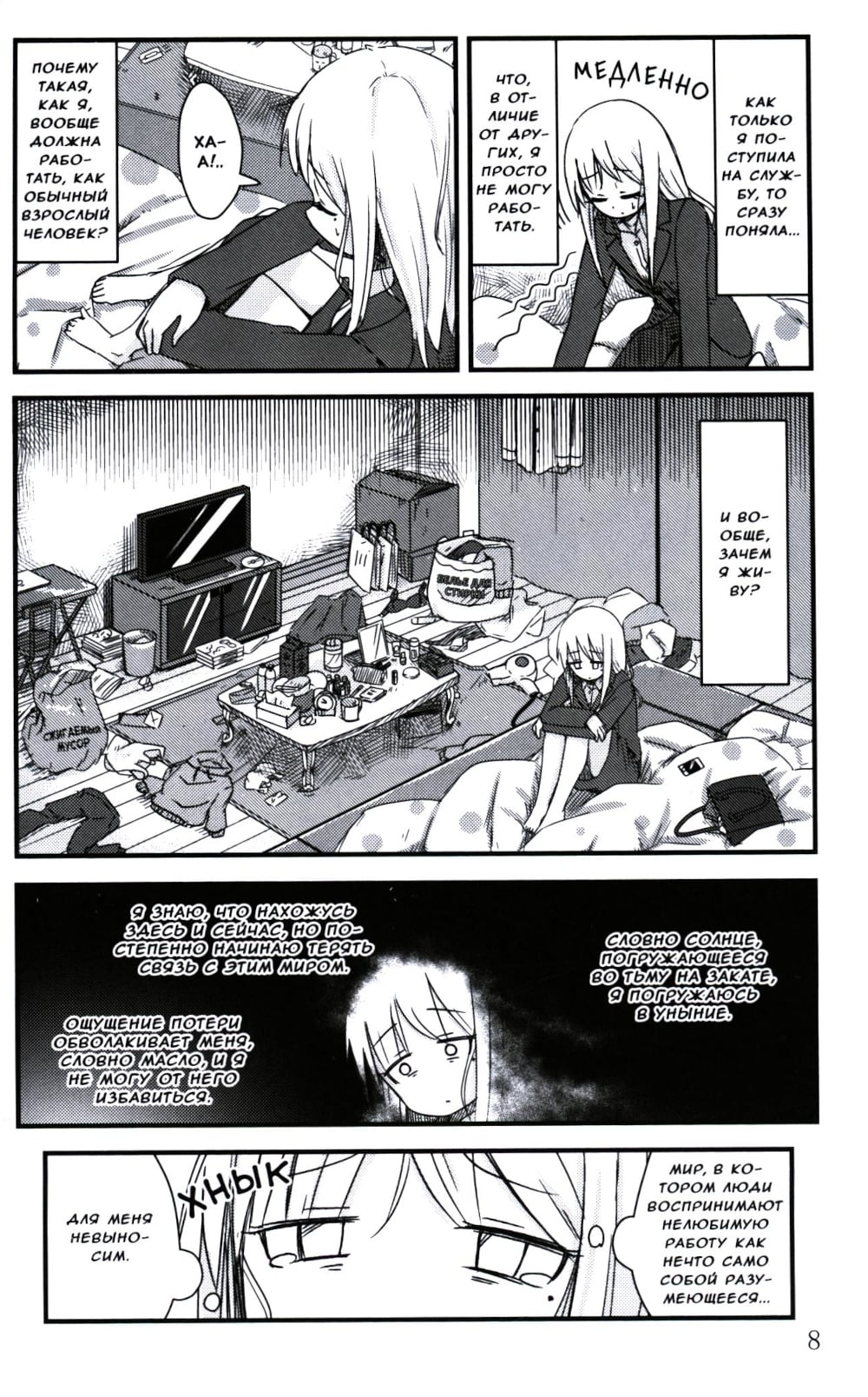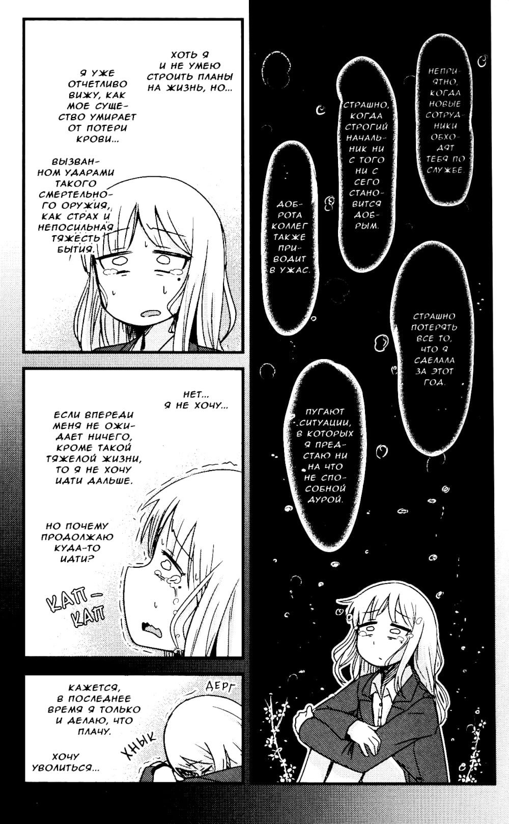 У Идзуми нет постоянной работы и в свои 25 лет она не может найти смысл жизни. Каждый ее день настолько однообразен и скучен, что порой ей становится трудно дышать... Внезапно она ловит себя на мысли: "Зачем я живу?" Сколько бы времени ни прошло, ей не удается обрести надежду на лучшее. Эта безрадостная история является отражением чувства тревоги, затаившегося в глубине души каждого человека.
