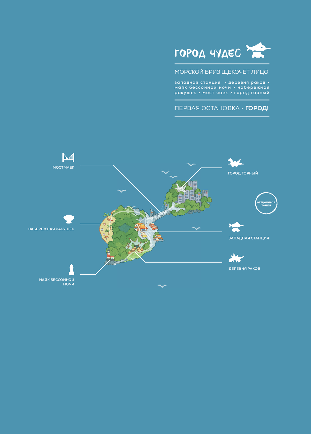 Книга разделена на четыре главы: "Морской бриз", "Город Мечты", "Затерянный рай" и "Пейзажи Северного островка". Внутри читателя ждет множество приключений: прогуляться до маяка, где нет места для сна, или полетать на бумажных самолетиках, поиграть с гигантским котэ или пощупать пушистые облачка.