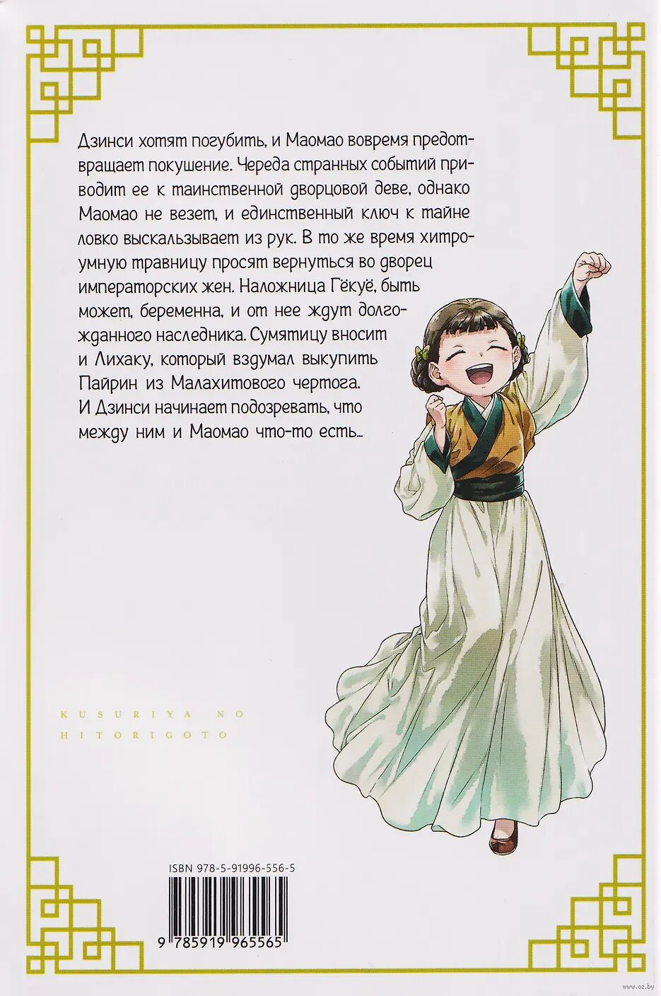 Дзинси хотят погубить, и Маомао вовремя предотвращает покушение. Череда странных событий приводит ее к таинственной дворцовой деве, однако Маомао не везет, и единственный ключ к тайне ловко выскальзывает из рук. В то же время хитроумную травницу просят вернуться во дворец императорских жен. Наложница Гёкуё, быть может, беременна, и от нее ждут долгожданного наследника. Сумятицу вносит и Лихаку, который вздумал выкупить Пайрин из Малахитового чертога. И Дзинси начинает подозревать, что между ним и Маомао что-то есть…