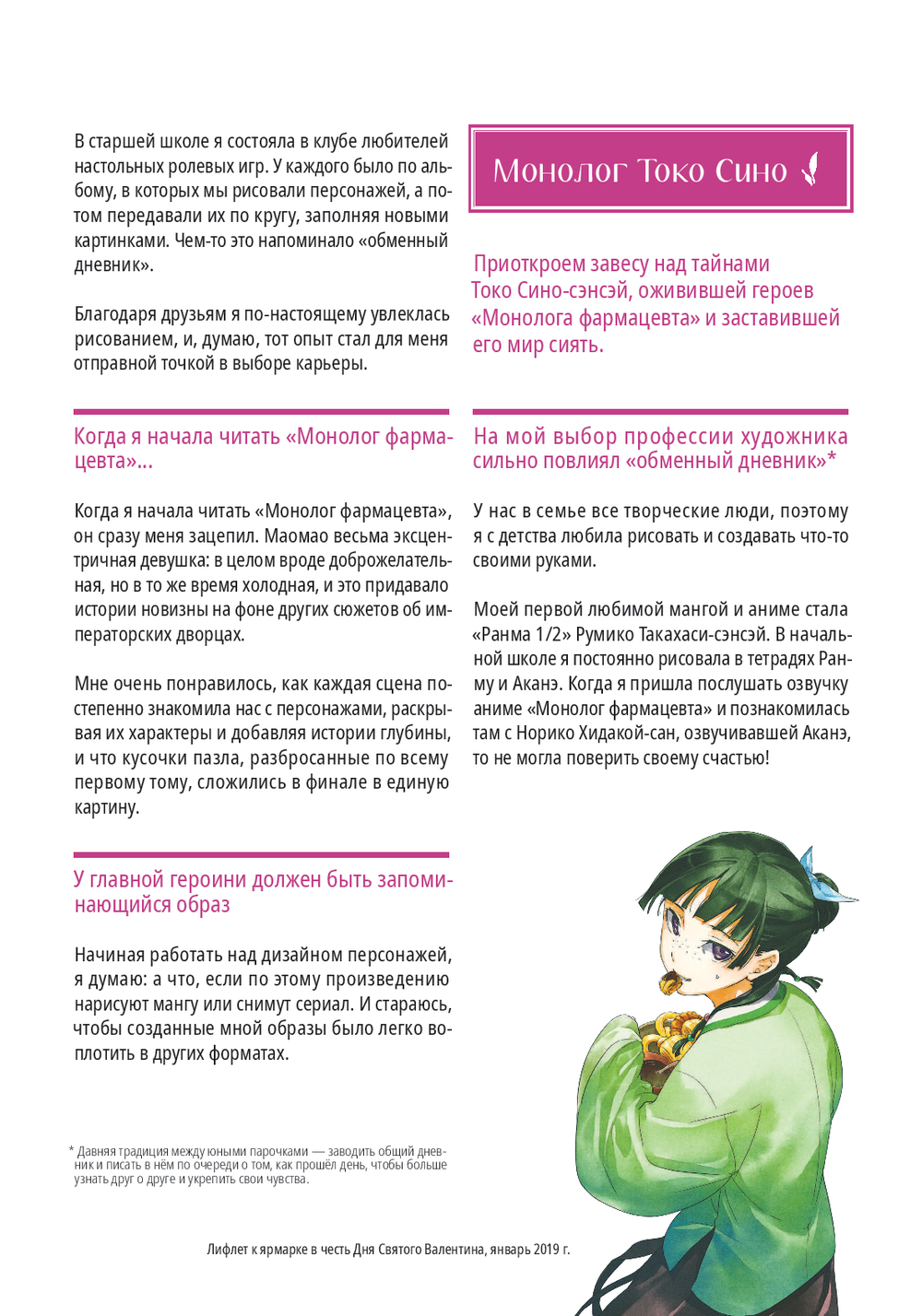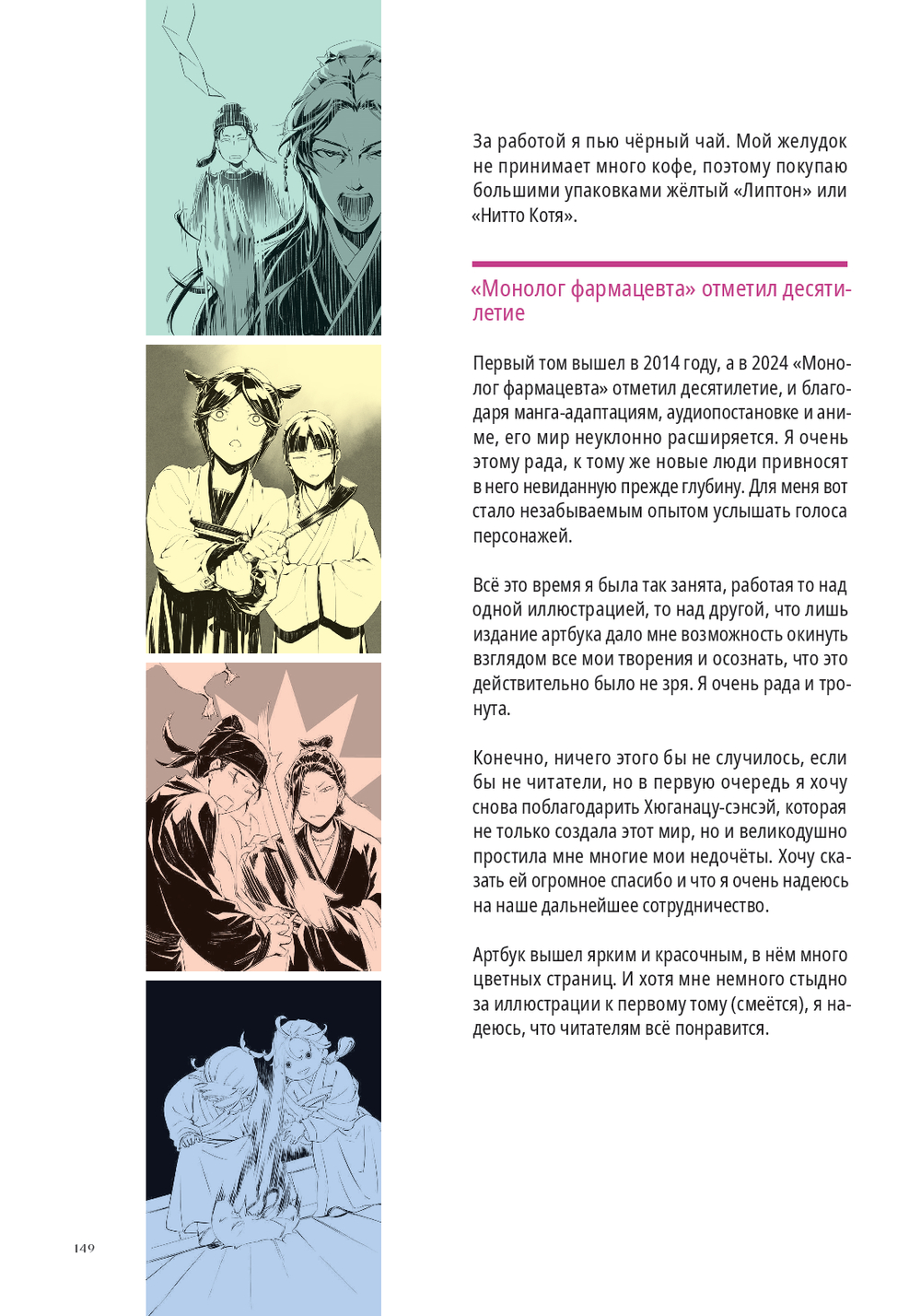 Артбук "Монолог фармацевта" – ваш проводник в мир любимой истории. Здесь собраны работы иллюстратора ранобэ Токо Сино, концепты персонажей с её комментариями, неопубликованные дизайны и эксклюзивные материалы, а также рассказ художницы о своём творческом пути. Более трёхсот артов позволят вам детально изучить главных героев и их окружение.