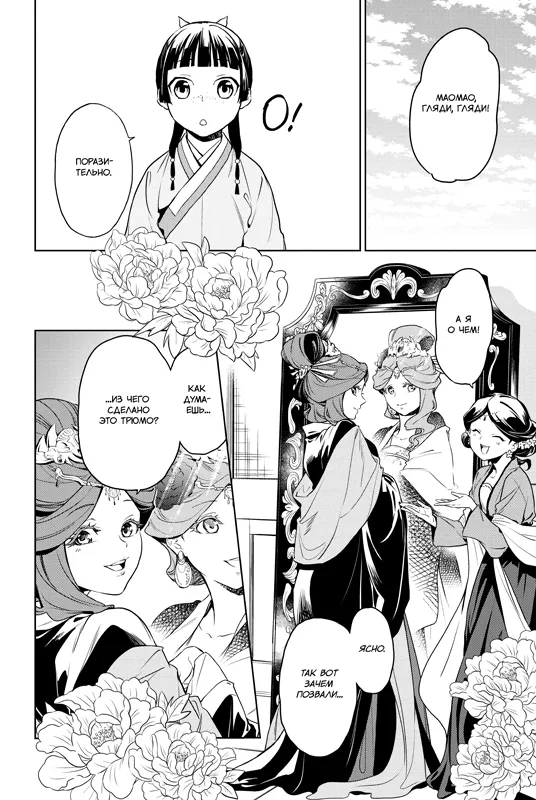 Наложница Гёкуё действительно ждет ребенка, и Маомао, приставленная к ней, теперь всюду видит происки врагов. Оправившись после случая с алтарем, она подозревает, что духи, платья и зеркала, привезенные чужестранцами в дар императорскому двору, ведут к новому покушению.