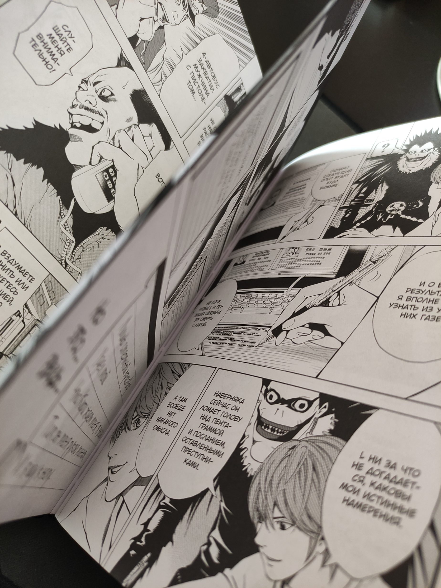 купил, открыл, удивился, что за такие скромные деньги- такое качество. черная, твердая, шикарная обложка, с выпирающими буквами и блестящим изображением Лайта, шикарная печать и неплохие арты, как дополнение к "коллекционке". так же порадовали переводы страниц тетради, пускай не самым лучшим образом, а так же сноски, поясняющие записи на японском. все сделано очень качественно и с душой! (ну и раз тут все говорят о "Черной закладочке!1!!", упомяну и ее: она есть, но большой роли не играет, ибо манга читается на 1 дыхании. Но для занятых людей- да, неплохо, правда если носить в рюкзаке/сумке - может быстро растрепаться.) вообщем: покупкой доволен, всем советую взять- очень достойно. 5/5 и "Лидер продаж"- вполне заслуженно.