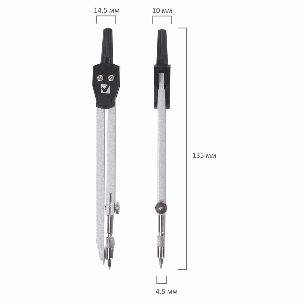 Циркуль длиной 135 мм имеет несгибаемые штанги. Изготовлен из металла, дополнительный цвет элементов – черный.