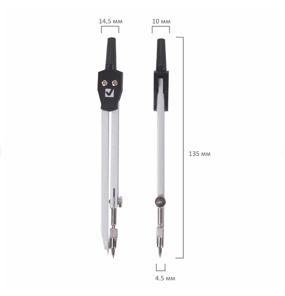 Циркуль длиной 135 мм имеет несгибаемые штанги. Изготовлен из металла, дополнительный цвет элементов – черный.