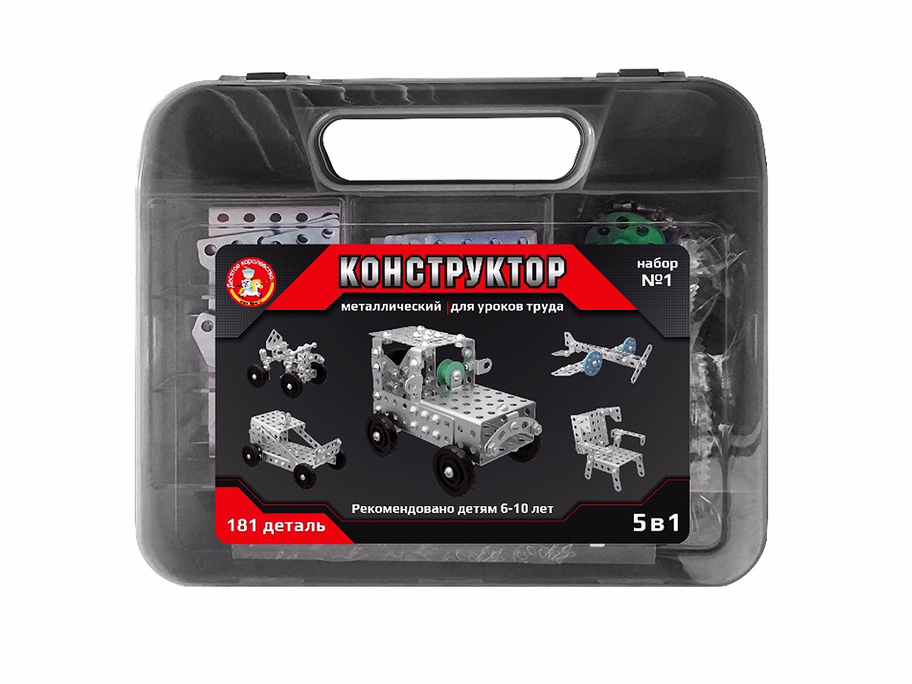 Металлический конструктор для уроков труда 5 в 1 "№1" в пластиковом чемоданчике – это универсальный набор для занятий конструированием. Из него можно собрать: багги, кресло, самолет, квадроцикл, УАЗ.