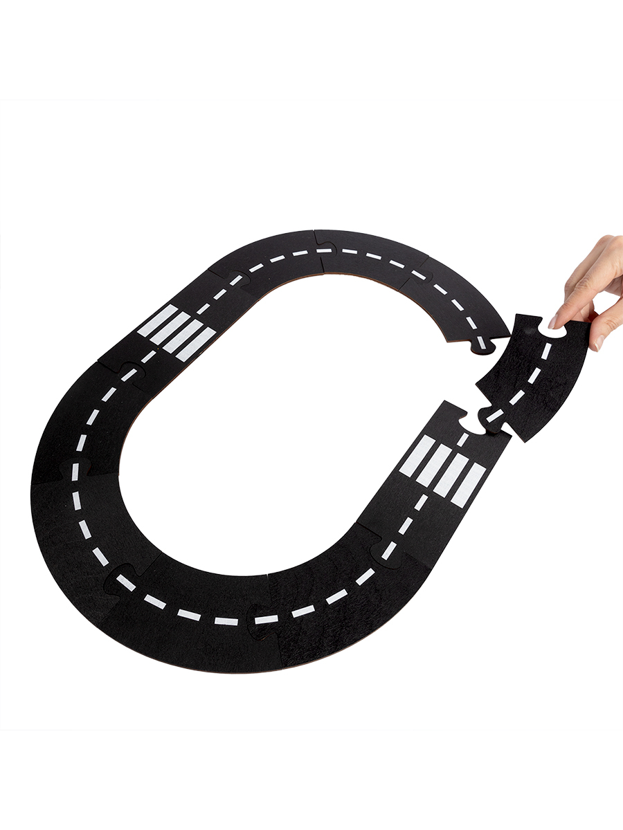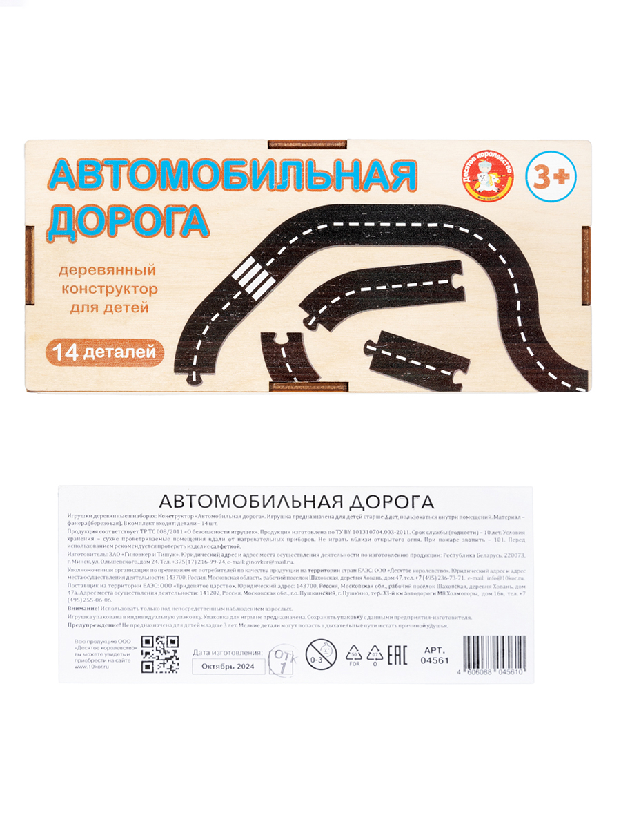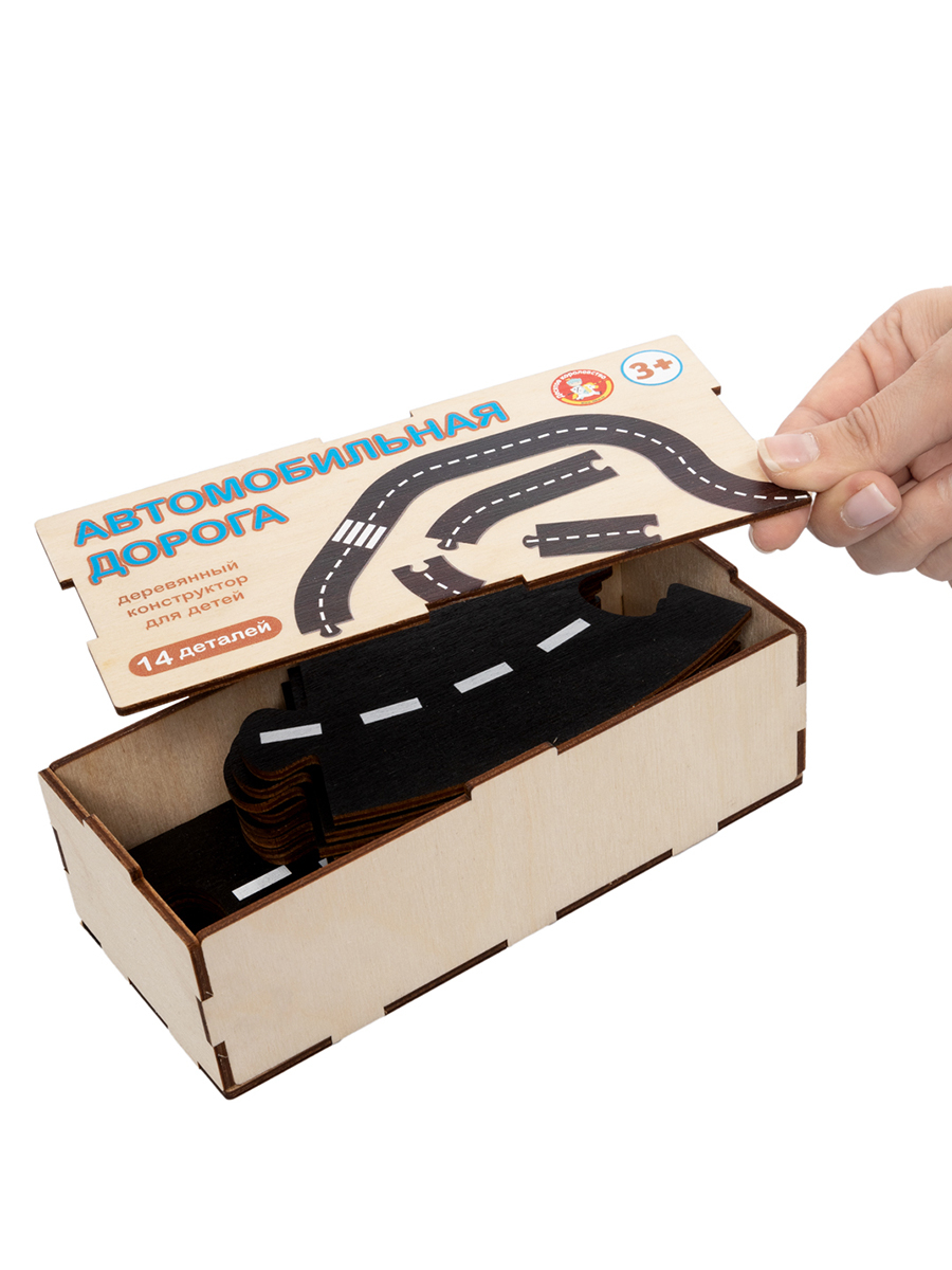 Деревянный конструктор "Автомобильная дорога" – это находка для юных автомобилистов. С его помощью можно собрать дорогу различной формы. Общая длина дороги в собранном виде 170 см. Конструктор хранится в деревянной коробочке.
